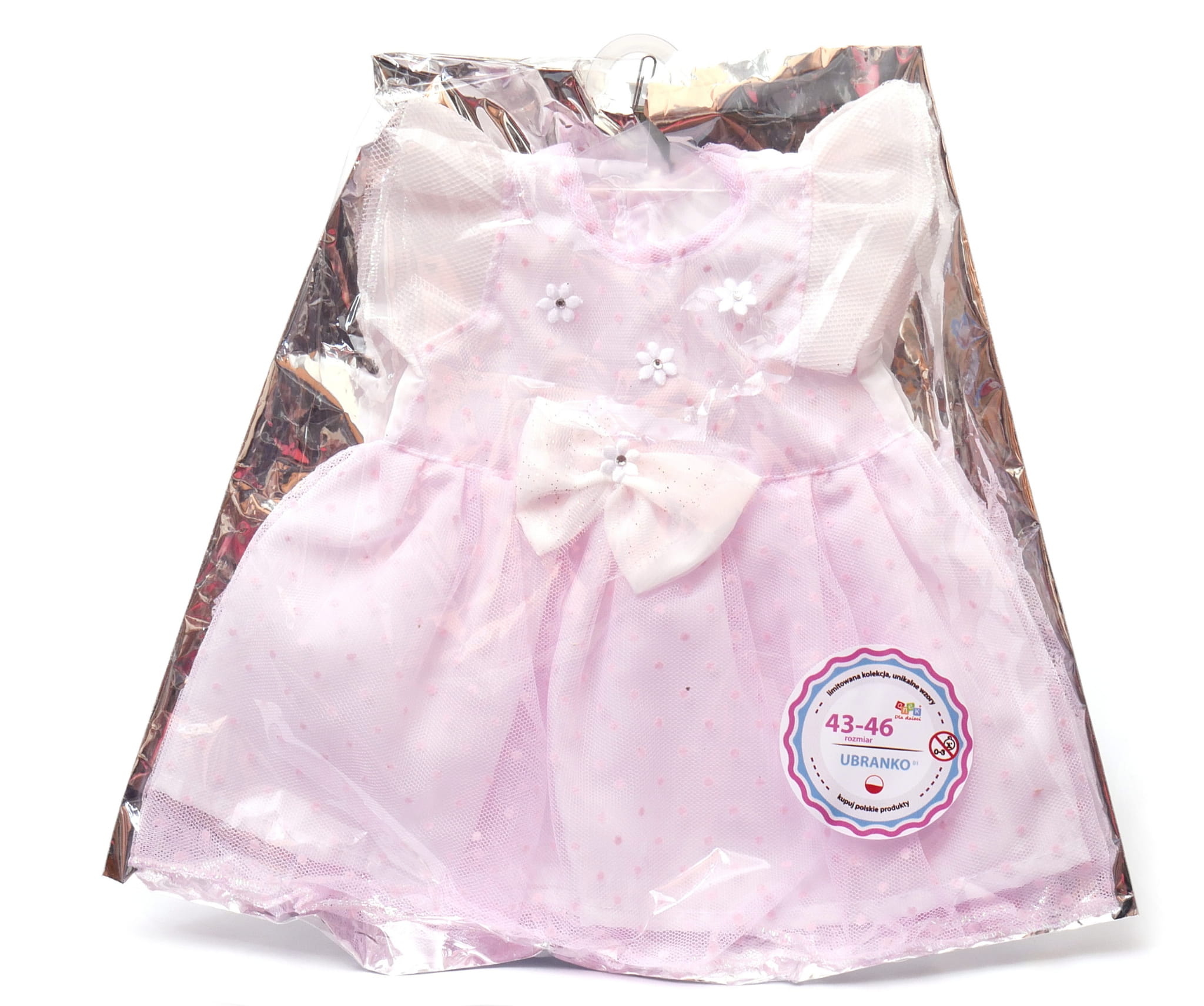 Śliczna różowa sukieneczka ozdobiona drobnymi kwiatkami z dżetami i uroczą białą kokardką.