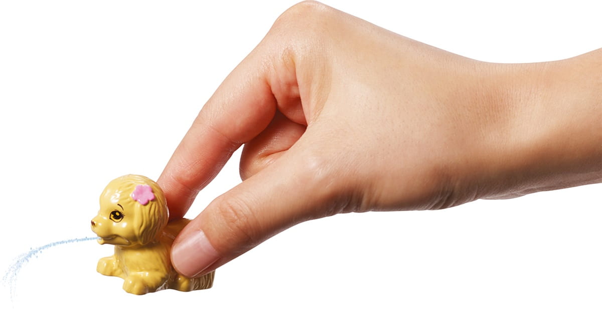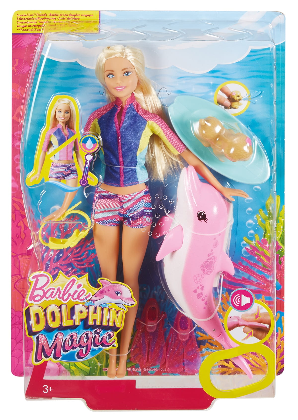 Przeżyj przygody inspirowane filmem „Barbie™ Delfiny z Magicznej Wyspy” razem z Barbie® i jej słodkimi przyjaciółmi! Barbie® ubrana jest w kolorowy top i szorty z nadrukiem. Już nie może się doczekać, kiedy zanurkuje w oceanie wspaniałej zabawy! Wow! Przy kontakcie z ciepłą wodą kamizelka lalki zmienia kolor z niebieskiego na różowy! Siedzący na desce surfingowej i psikający wodą szczeniaczek chętnie dołączy do zabawy! Ależ słodko wygląda z tą różową kokardką. Załóż maskę do snorkelingu oraz płetwy do nurkowania i pozwól Barbie® odkrywać ocean w towarzystwie jej przyjaciela delfina. Naciśnij ogon delfina, aby usłyszeć realistyczne odgłosy, dzięki którym ta tropikalna przygoda stanie się jeszcze ciekawsza. Wielbicielki wakacyjnych przygód pokochają odgrywać ulubione scenki i opowiadać własne historyjki zarówno nad, jak i pod poziomem morza, bo z Barbie® możesz być kim chcesz. Zbierz wszystkie lalki i akcesoria z serii Barbie™ Delfiny z Magicznej Wyspy (sprzedawane oddzielnie w zależności od dostępności). W zestawie lalka Barbie® w ubrankach (ze zmieniającą kolory kamizelką) i z akcesoriami, delfin z ogonem aktywującym dźwięk, tryskający wodą szczeniaczek, płetwy i maska do nurkowania. Lalka nie stoi samodzielnie. Kolory i elementy dekoracyjne mogą się różnić.