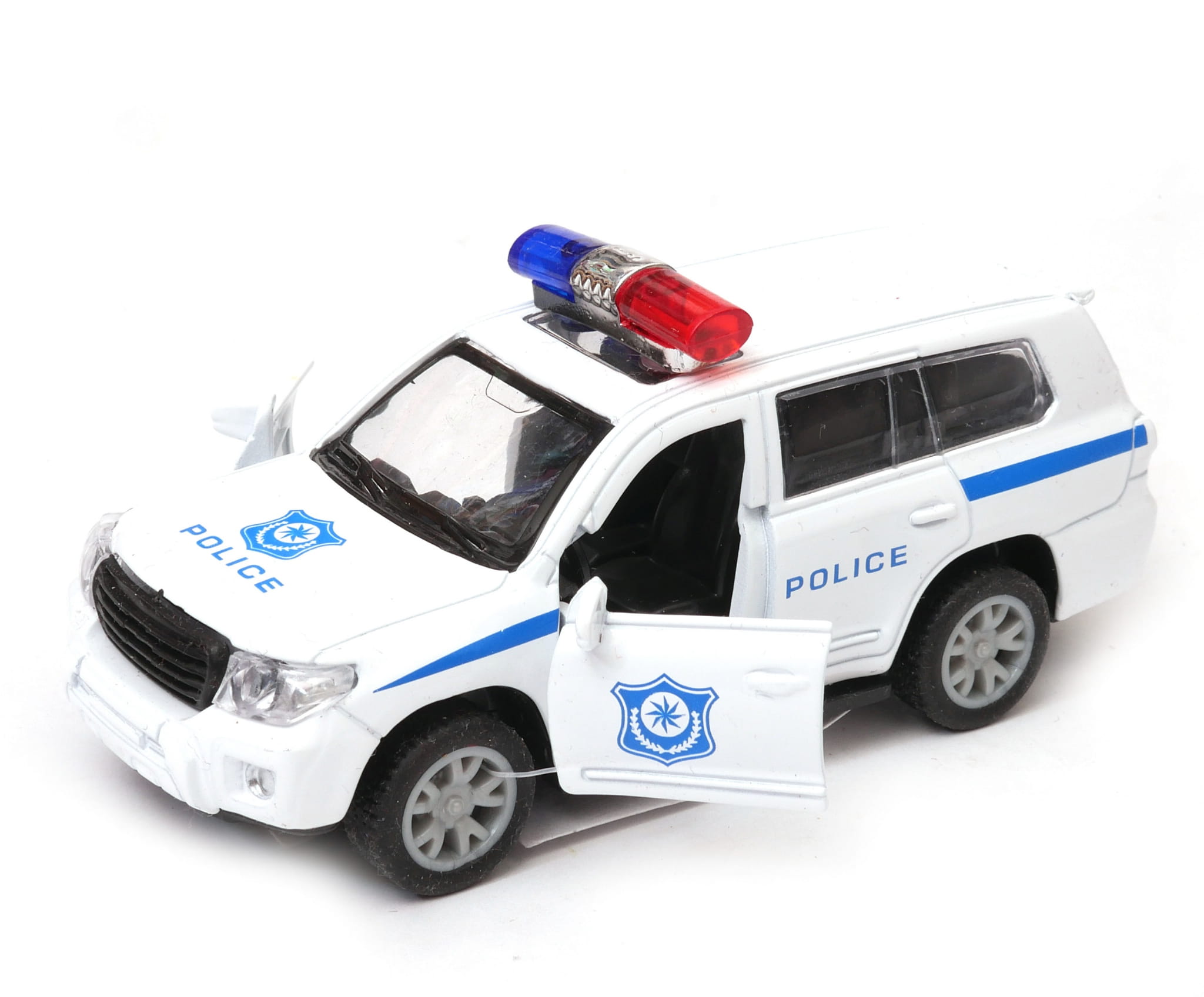 Radiowóz po dociśnięciu do podłogi wydaje dźwięki i włączają się światła. Wyposażony jest w napęd pull-back. Radiowóz ma otwierane drzwi.