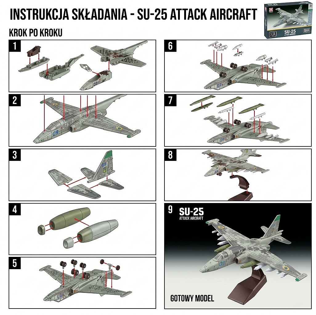 Odkryj fascynujący świat nowoczesnego lotnictwa wojskowego z modelem samolotu szturmowego SU-25 Attack Aircraft. Ten unikalny zestaw klocków konstrukcyjnych to idealna propozycja dla każdego pasjonata militariów, który ceni sobie estetykę wykonania i prostotę montażu.