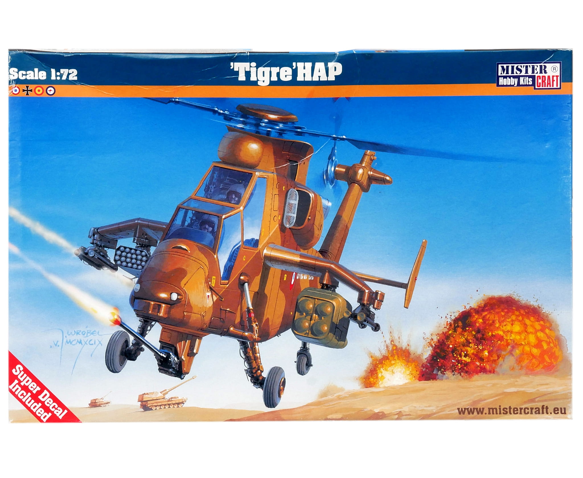 Plastikowy model do sklejania znanej marki Mister Craft. Marka dysponuje dość szerokim asortymentem modeli samolotów wojskowych i cywilnych w różnych skalach.W zestawie znajdują się kalkomanie z grafikami do naniesienia na sklejany model.
