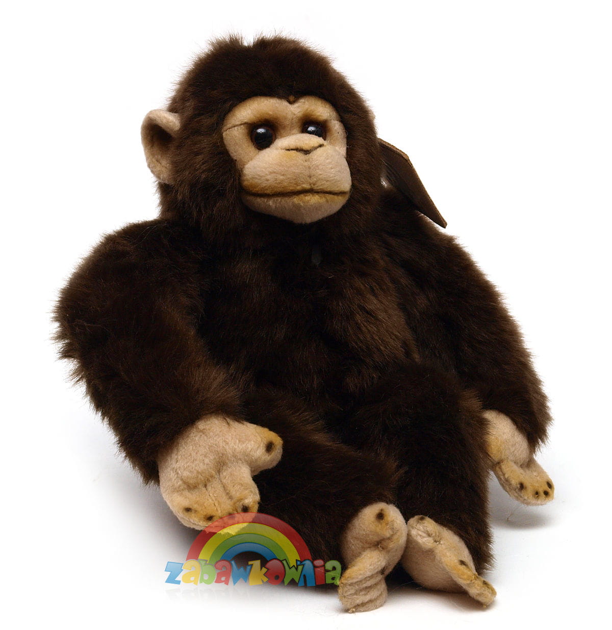Śliczny duży szympans pluszowy. Maskotka wyjątkowo wiernie odzwierciedla zwierzę występujące w naturze. Taki pluszak może stanowić wyjątkowy podarek dla dziecka kochającego małpki, a zwłaszcza ten gatunek.
