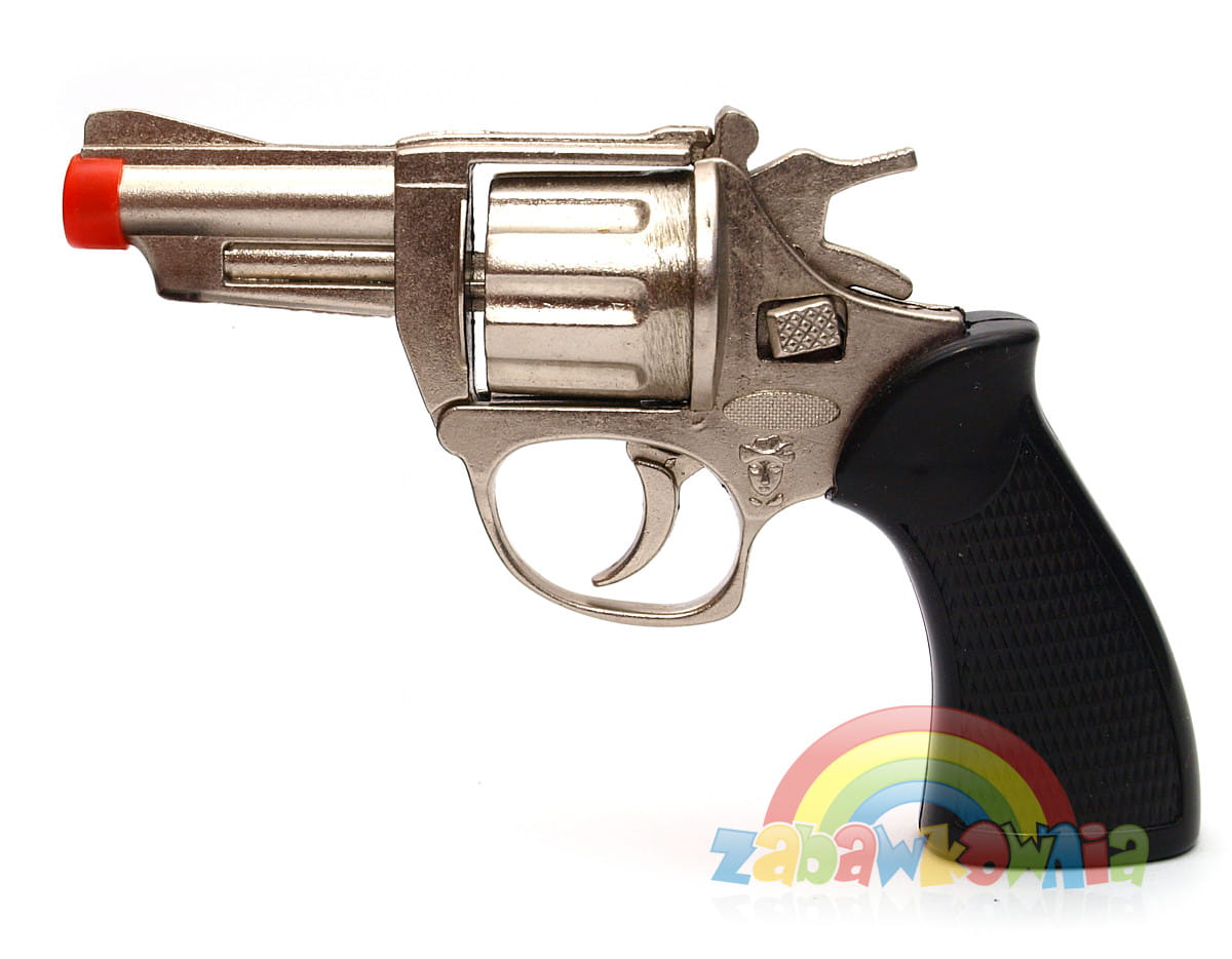 Prawdziwy rewolwer dla małego rewolwerowca. Ciężki, metalowy i błyszczący. Ale najważniejsze, że po naciśnięciu przycisku można załadować magazynek z kapiszonami i cieszyć się prawdziwymi wystrzałami. Budowa magazynku i iglicy zapobiega wydostawaniu się iskier i dymów w stronę strzelającego.