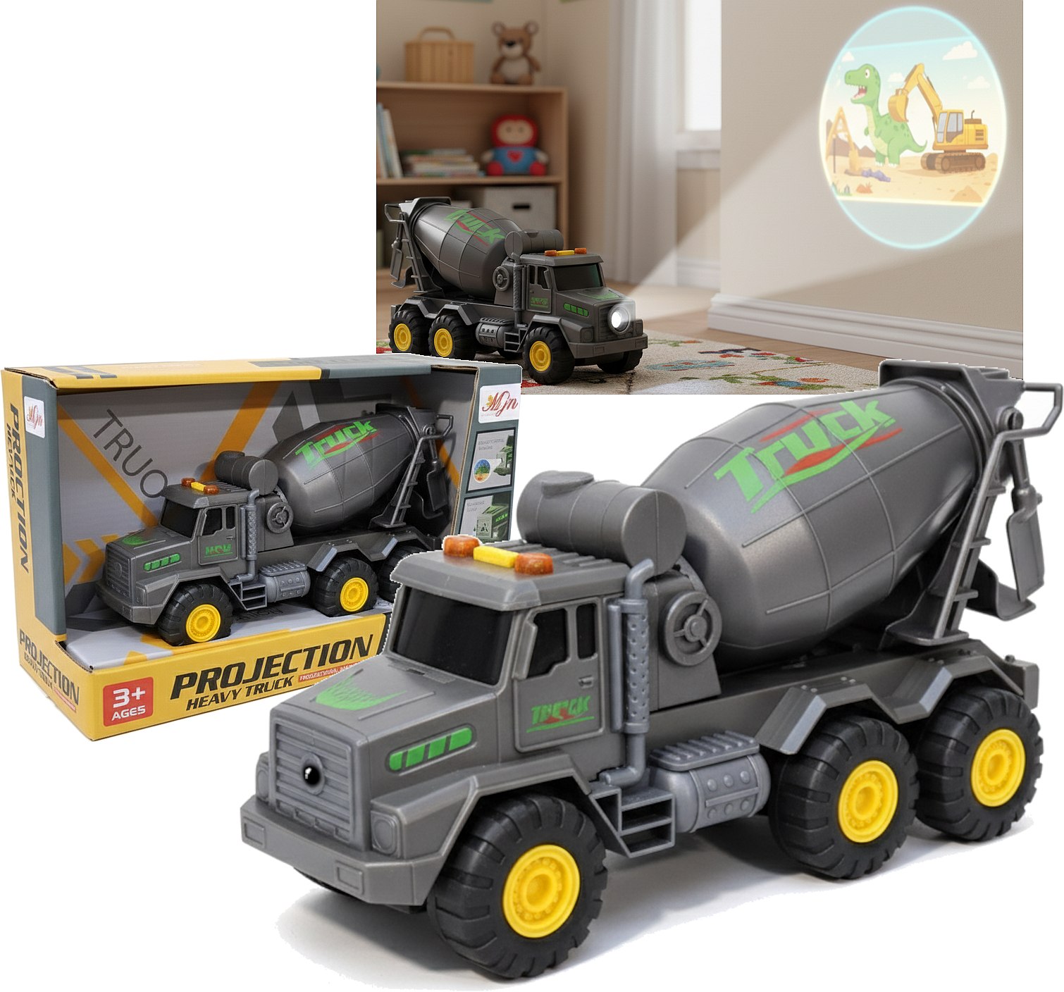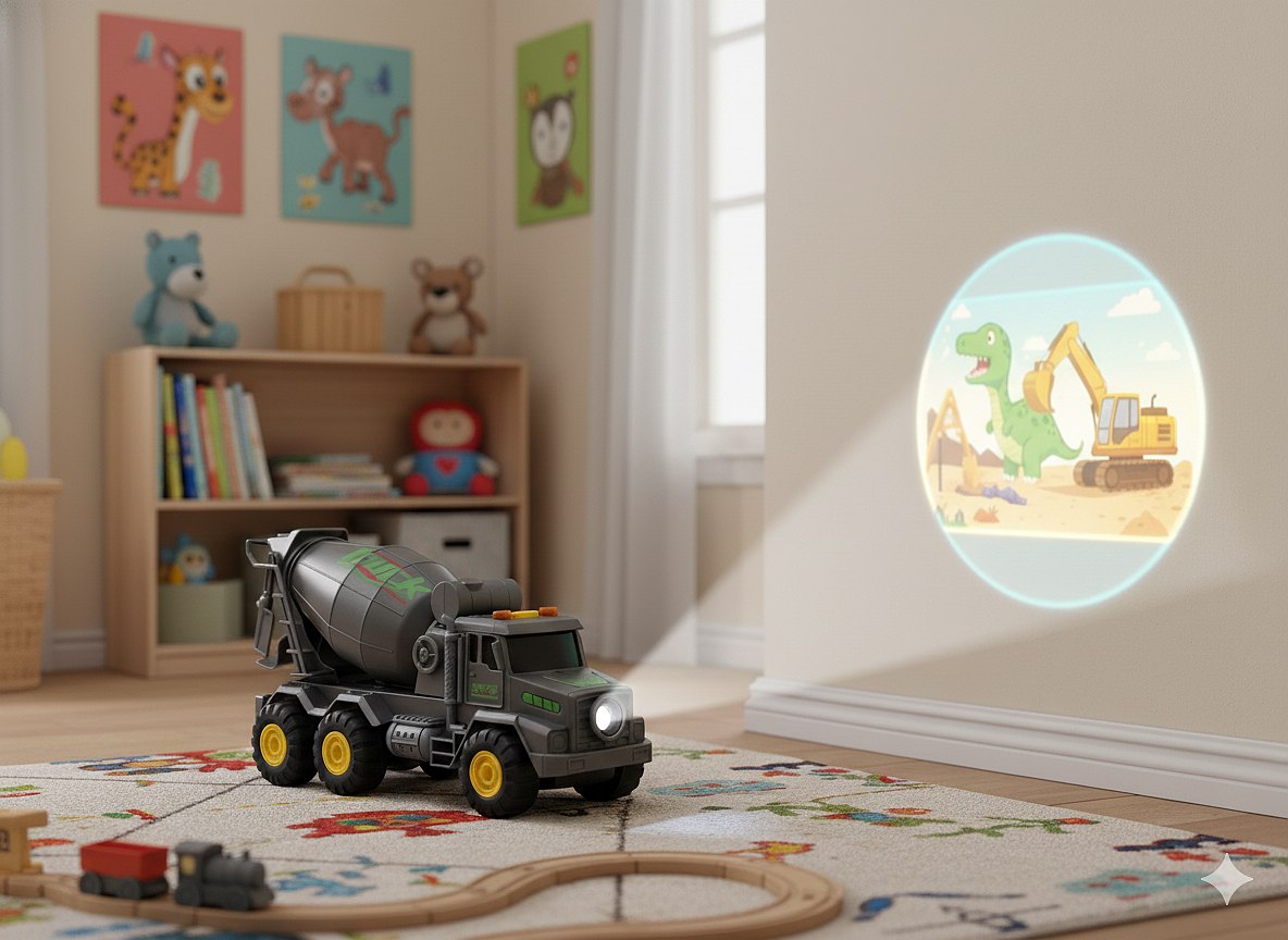 Projektor w Przodzie Pojazdu: Z przodu betoniarki umieszczono wbudowany projektor, który pozwala wyświetlać na ścianie fascynujące, kuliste obrazy z motywami budowlanymi lub innymi wesołymi scenkami. To idealny sposób na stworzenie magicznej atmosfery w pokoju i pobudzenie wyobraźni dziecka.