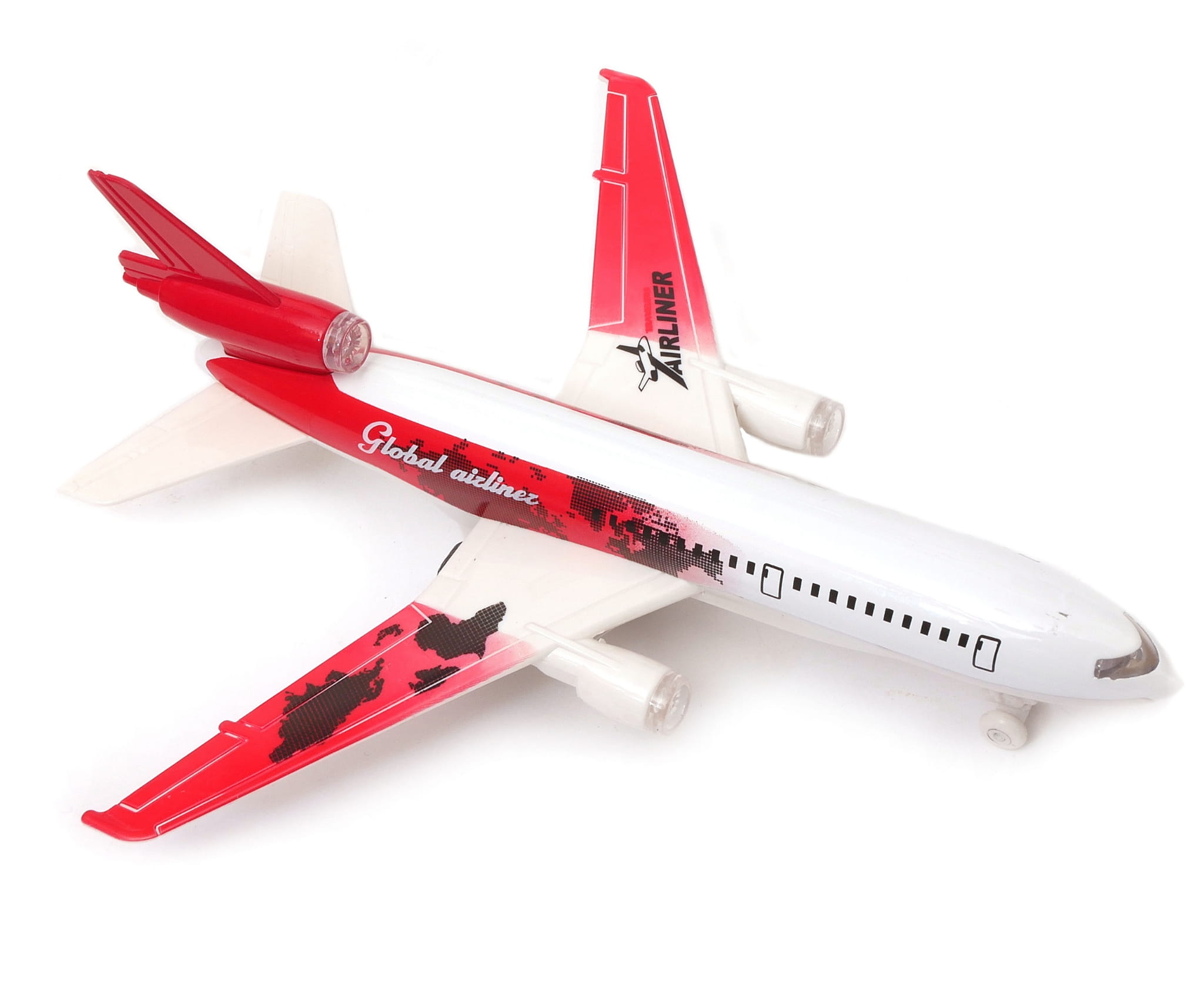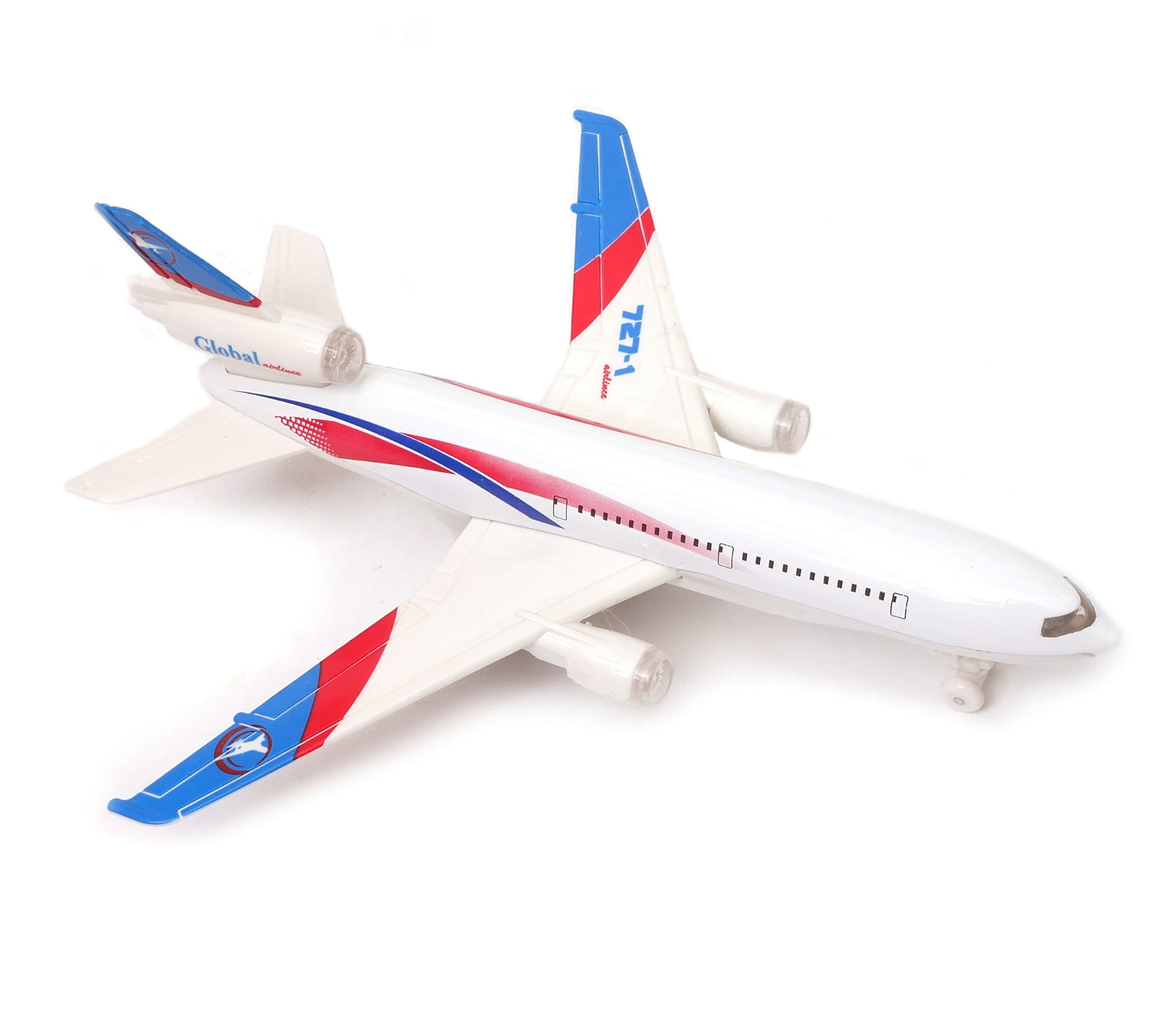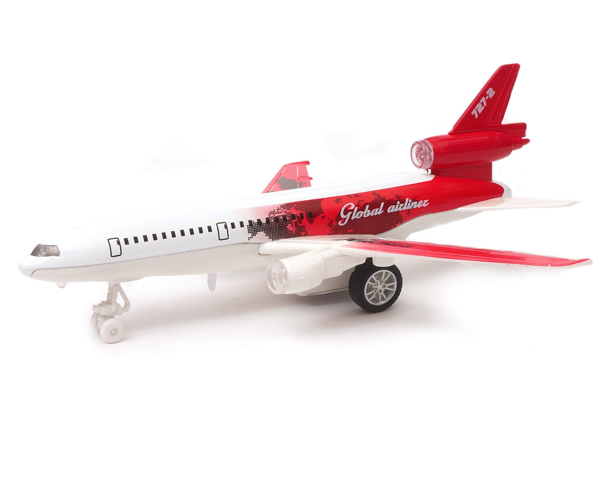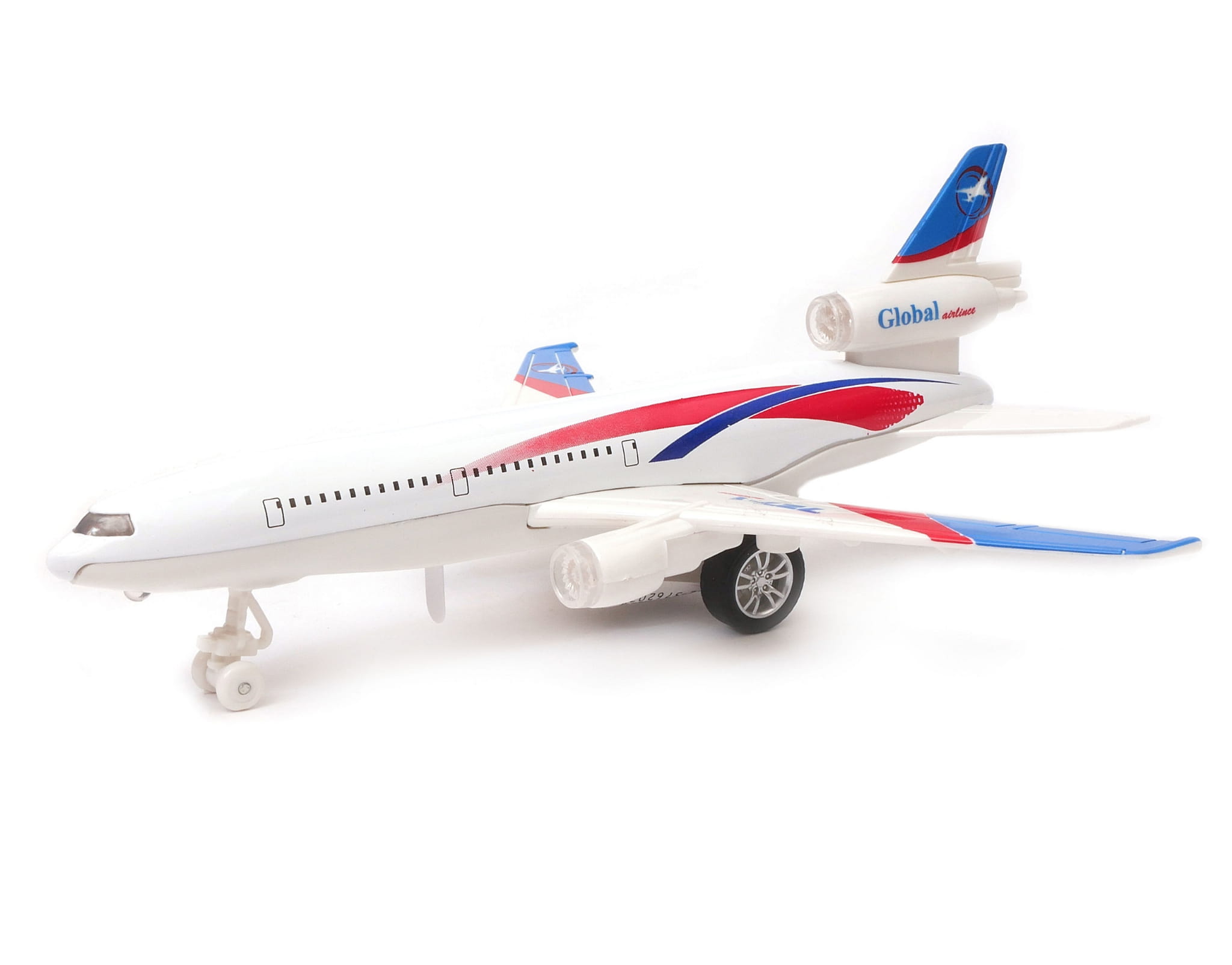 Metalowo plastikowy model samolotu pasażerskiego z dźwiękiem i światłem. Koła samolotu zostały wyposażone w napęd pullback, a po jego dociśnięciu do podłoża włączy się dźwięk i zapalą się światła silnika i kokpitu. Ten trzy silnikowy odrzutowiec spodoba się małym miłośnikom awiacji.