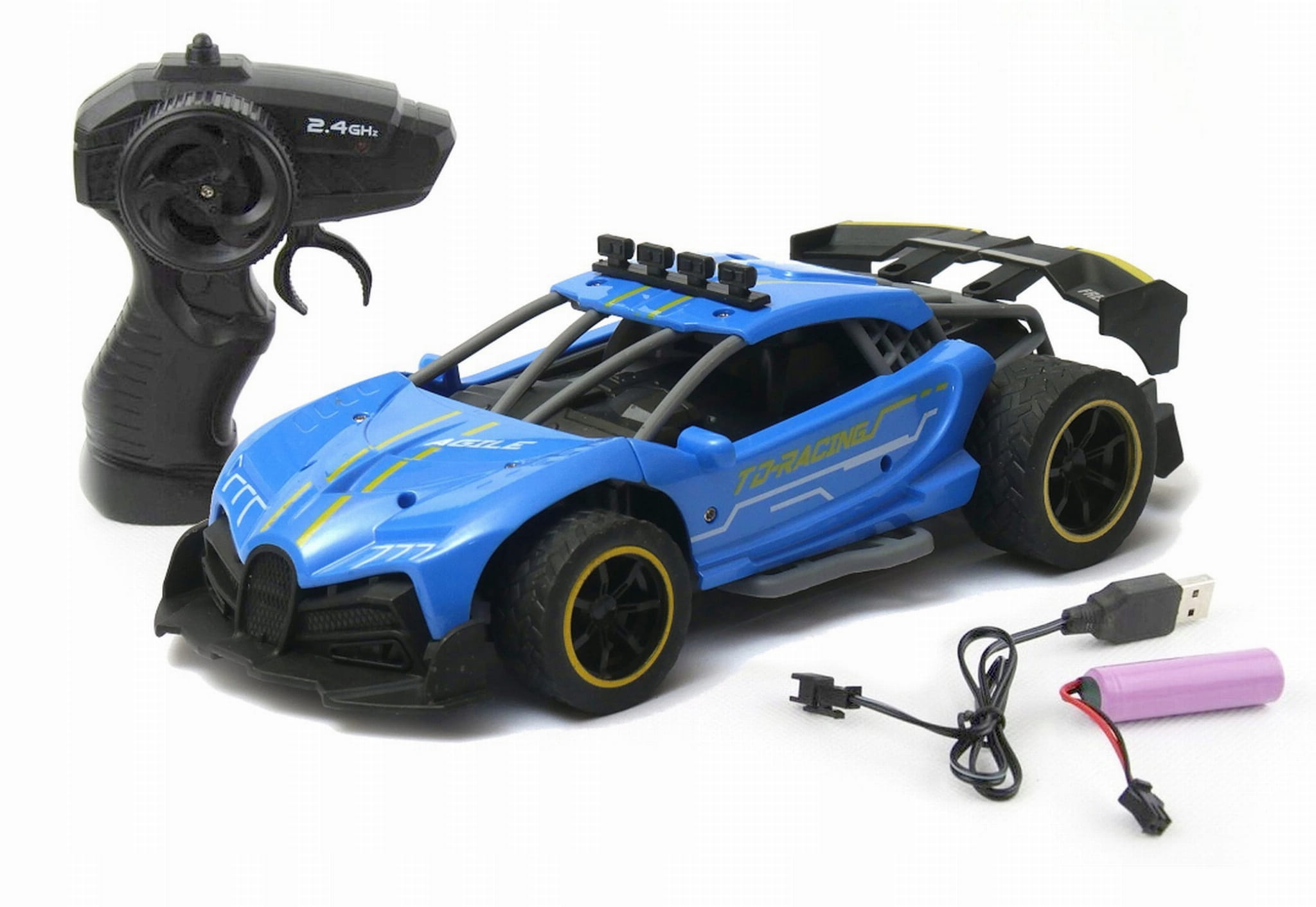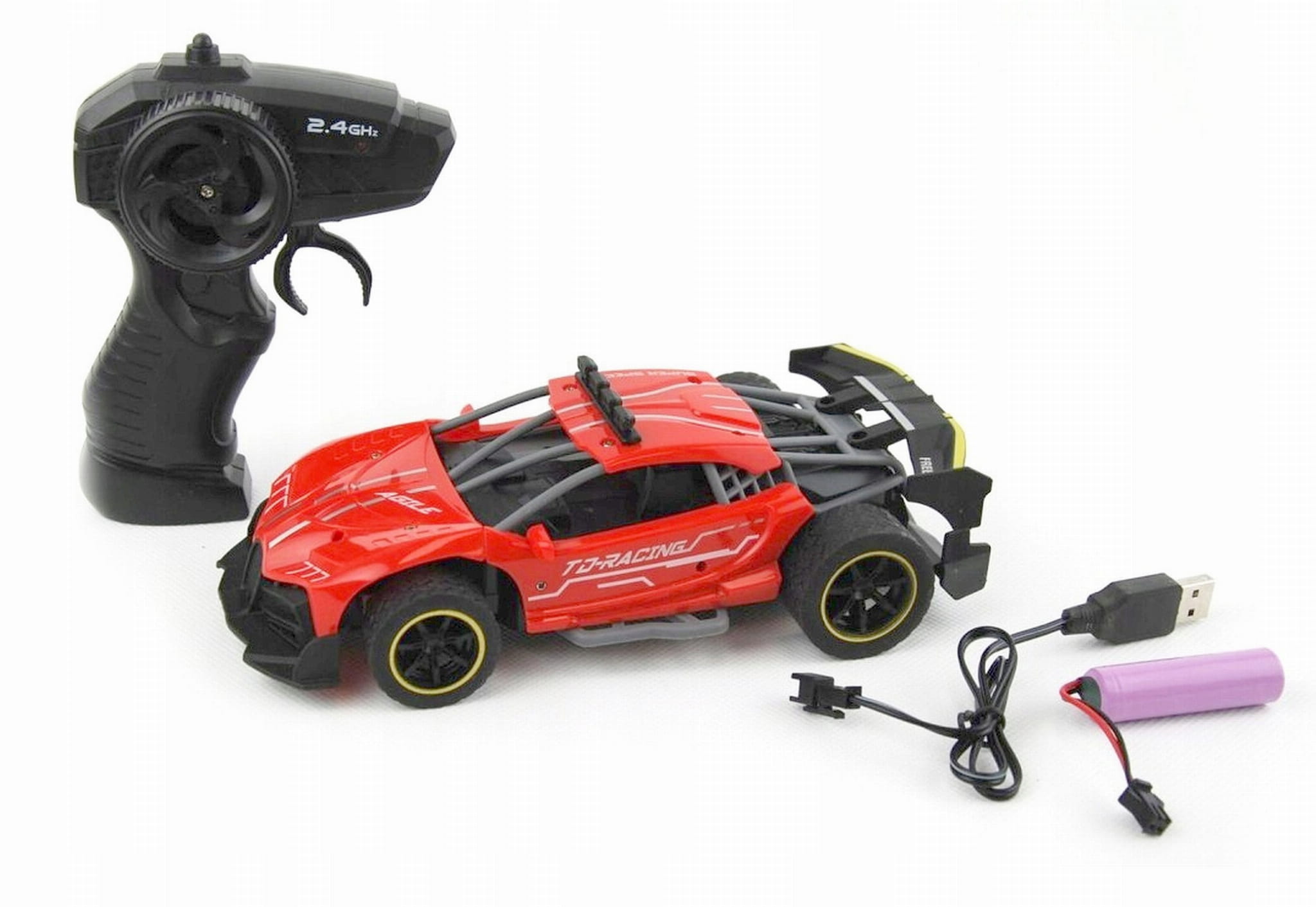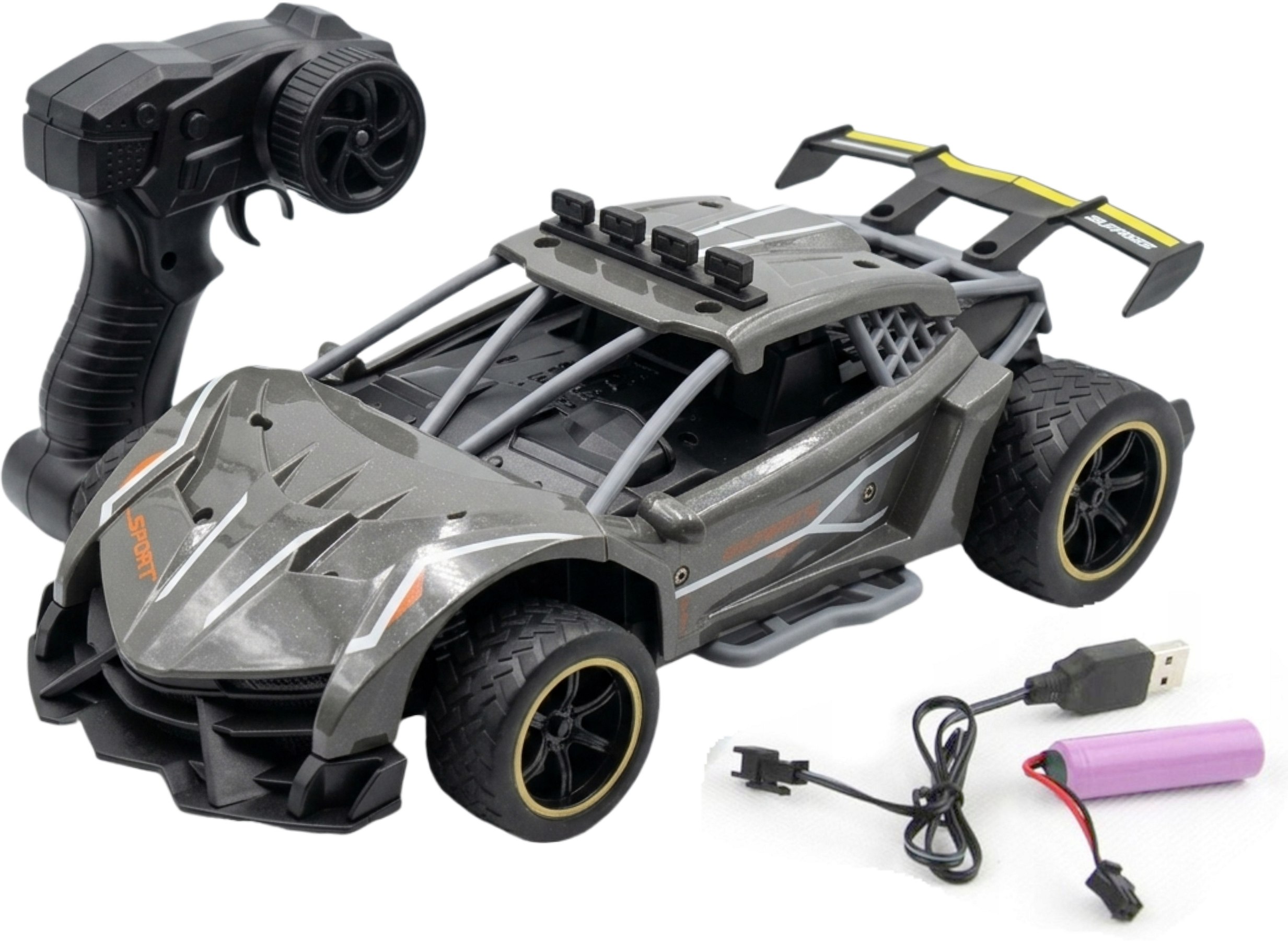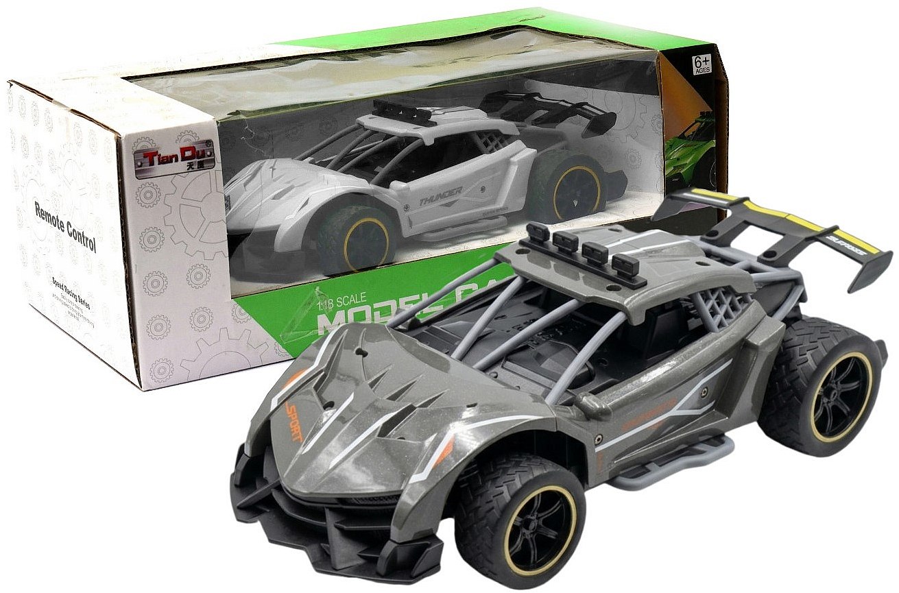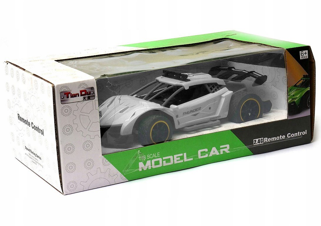 Zdalnie sterowany samochód sportowy wyposażony w pilot zdalnego sterowania działający w paśmie 2,4GHz. Do auta dołączona jest ładowarka wraz z akumulatorkiem Litowo polimerowym.