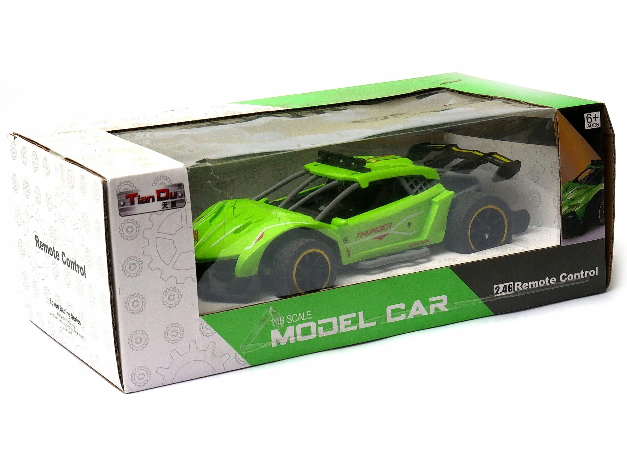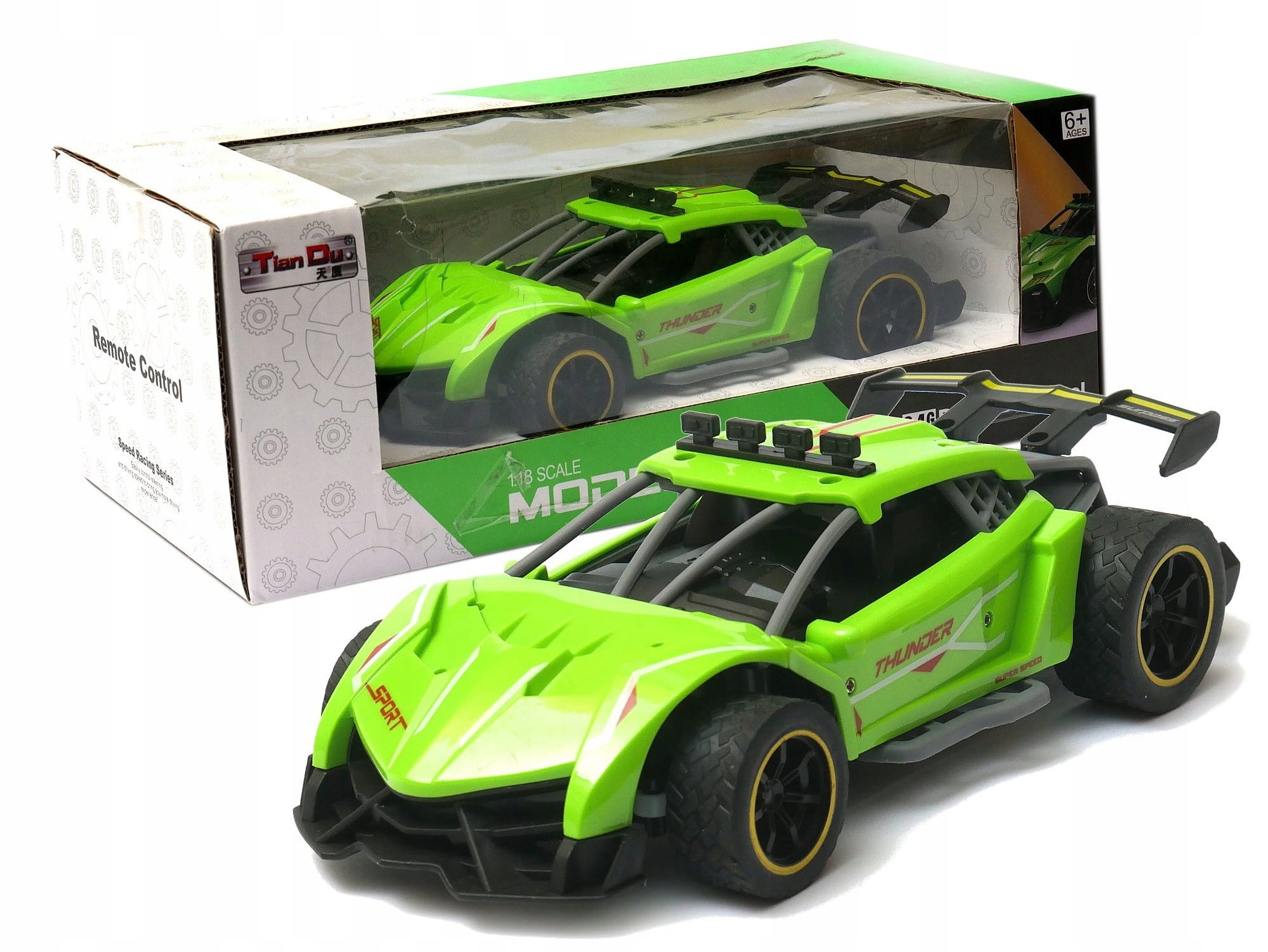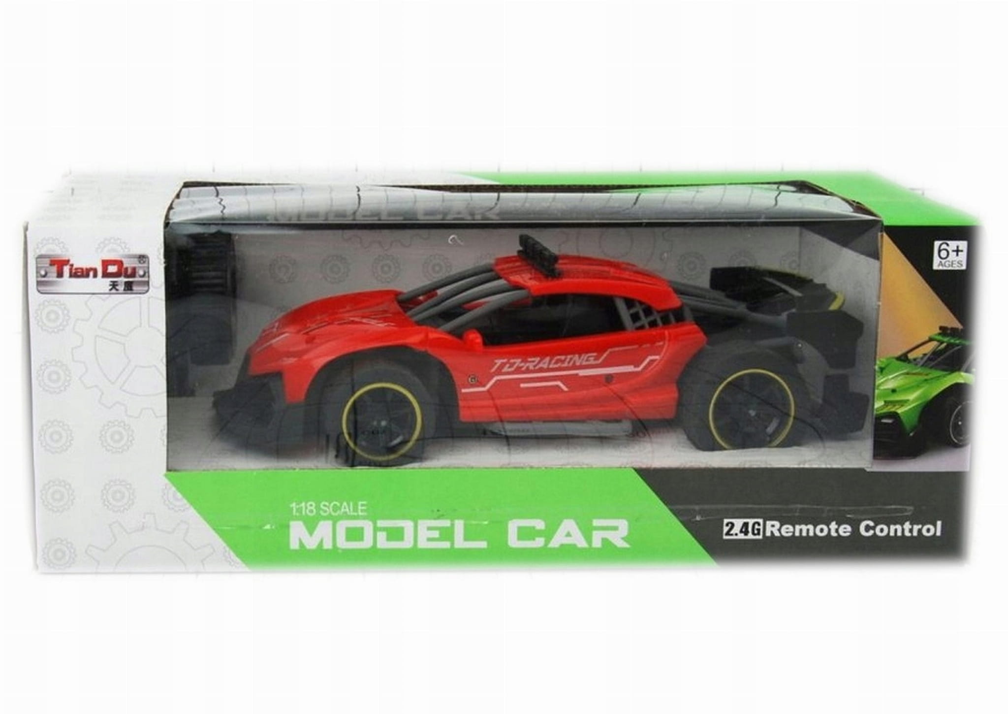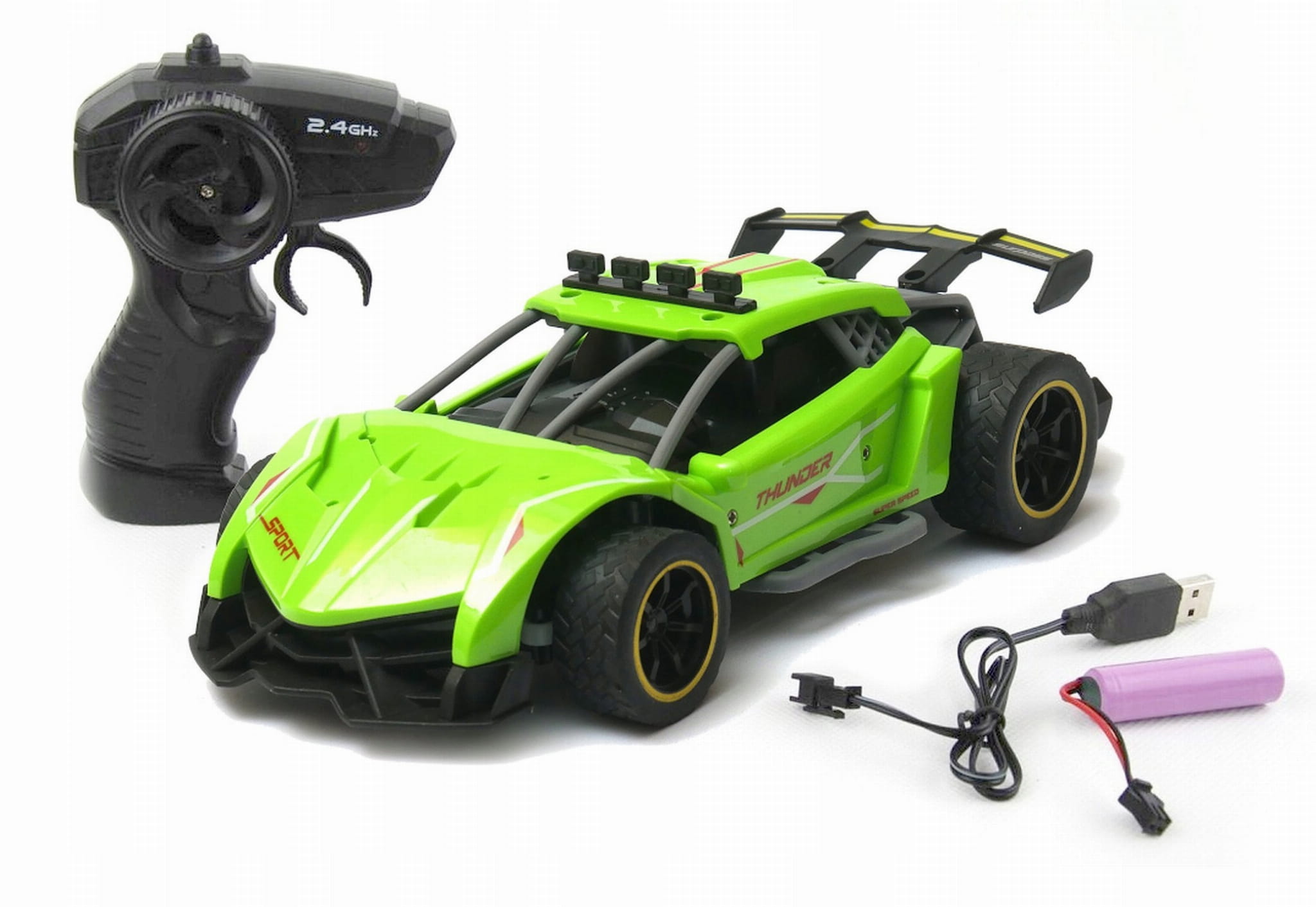 Zdalnie sterowany samochód sportowy wyposażony w pilot zdalnego sterowania działający w paśmie 2,4GHz. Do auta dołączona jest ładowarka wraz z akumulatorkiem Litowo polimerowym.