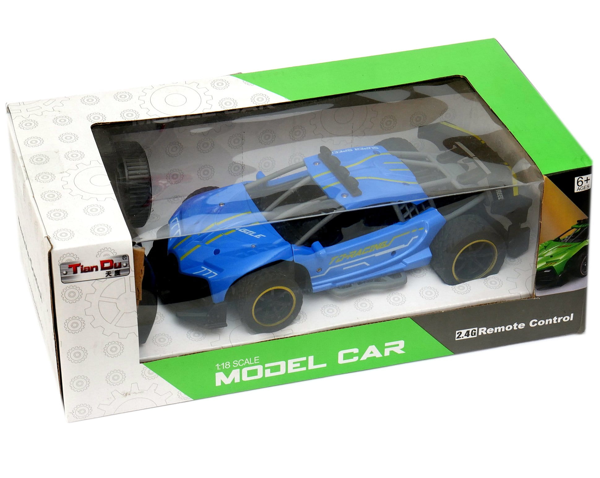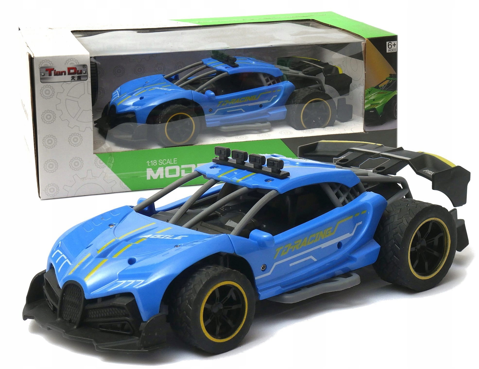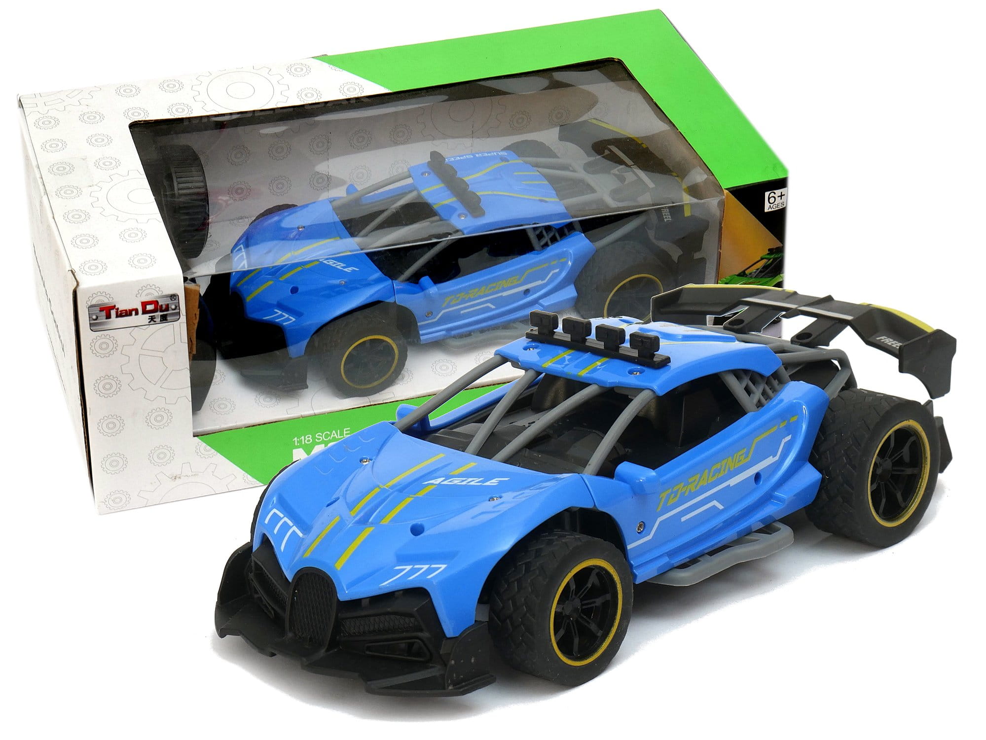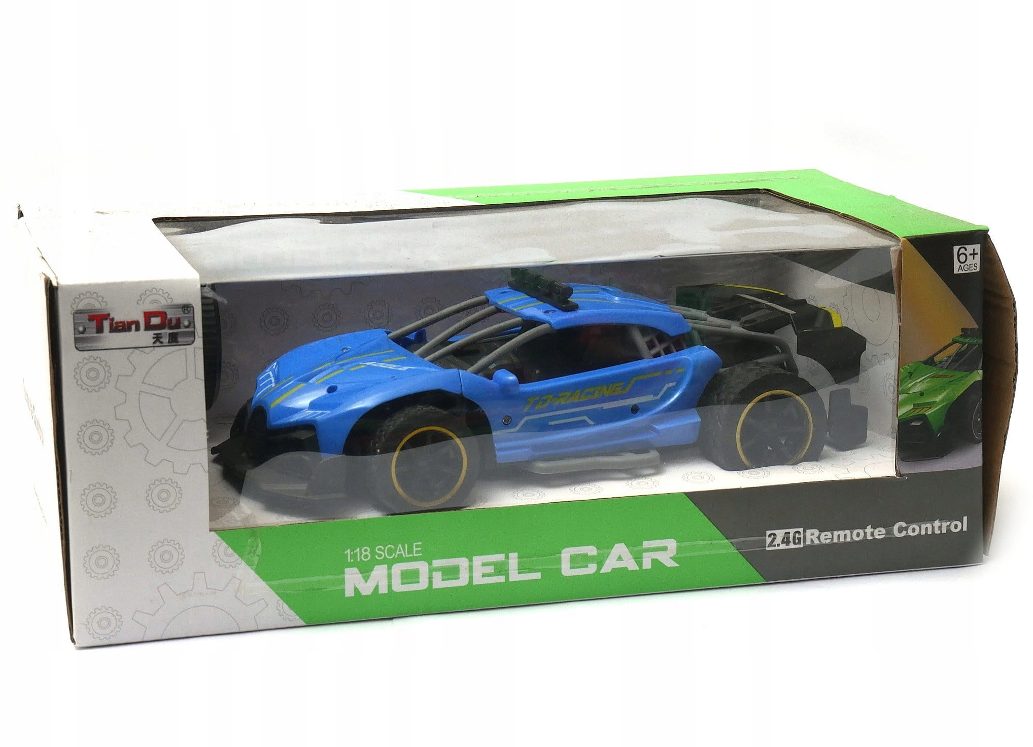 Zdalnie sterowany samochód sportowy wyposażony w pilot zdalnego sterowania działający w paśmie 2,4GHz. Do auta dołączona jest ładowarka wraz z akumulatorkiem Litowo polimerowym.