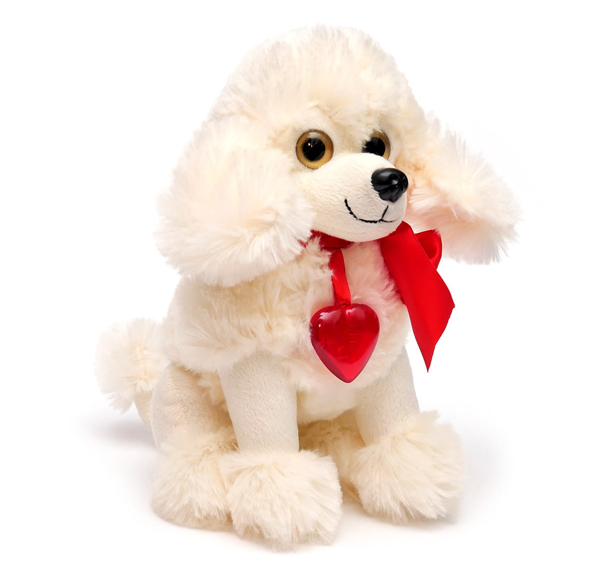 Śliczny pudelek z czerwona kokardą na szyi. Na kokardzie wisi czerwone kryształowe i lśniące serduszko.