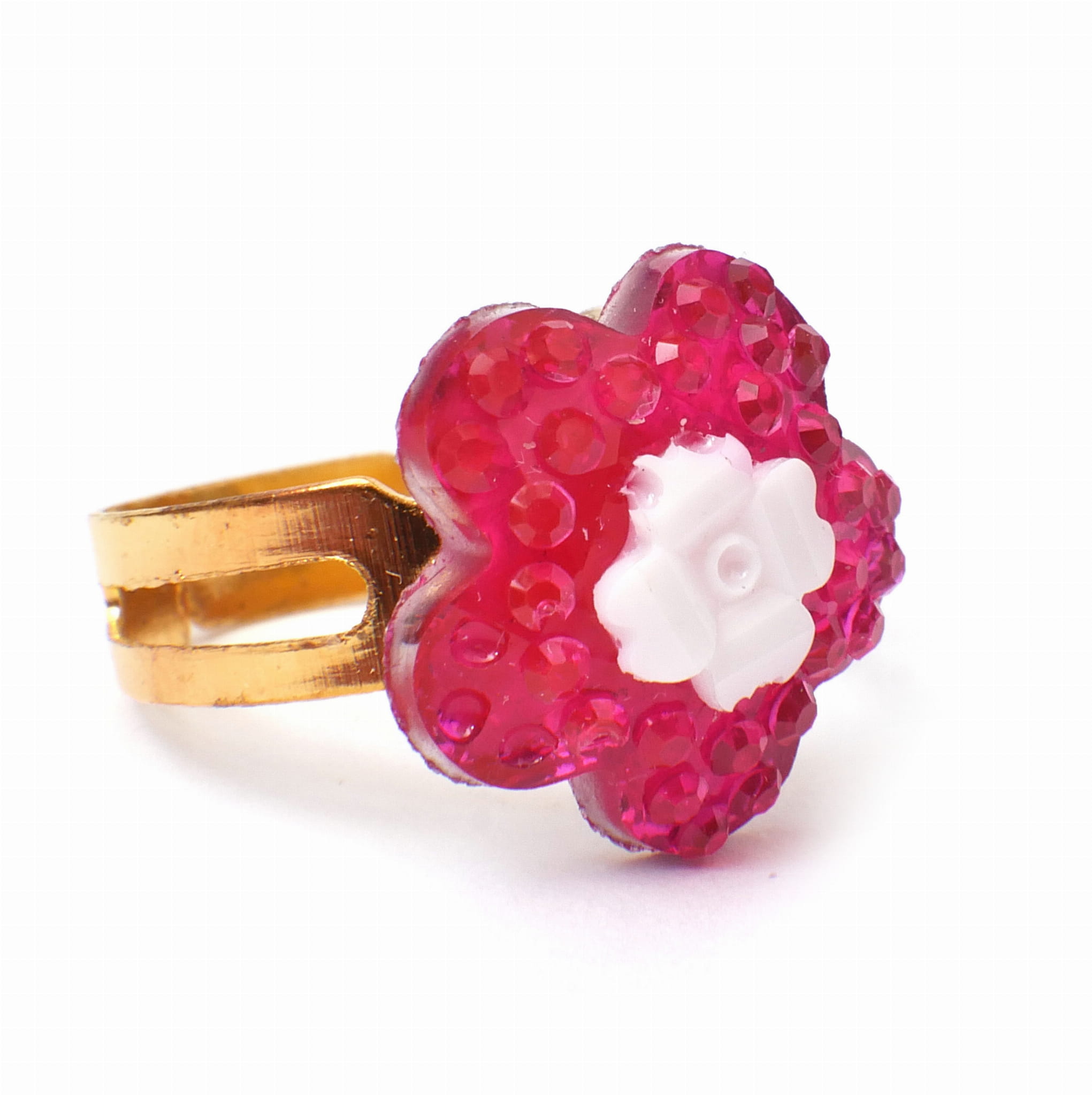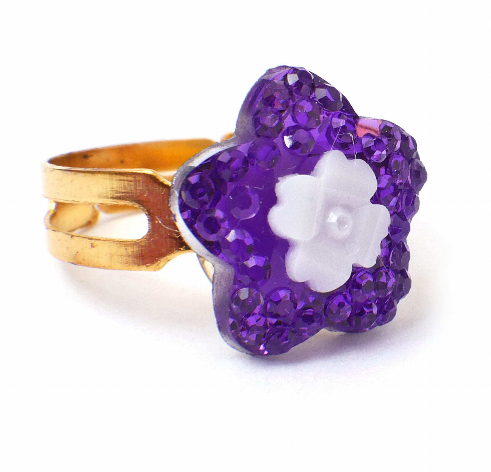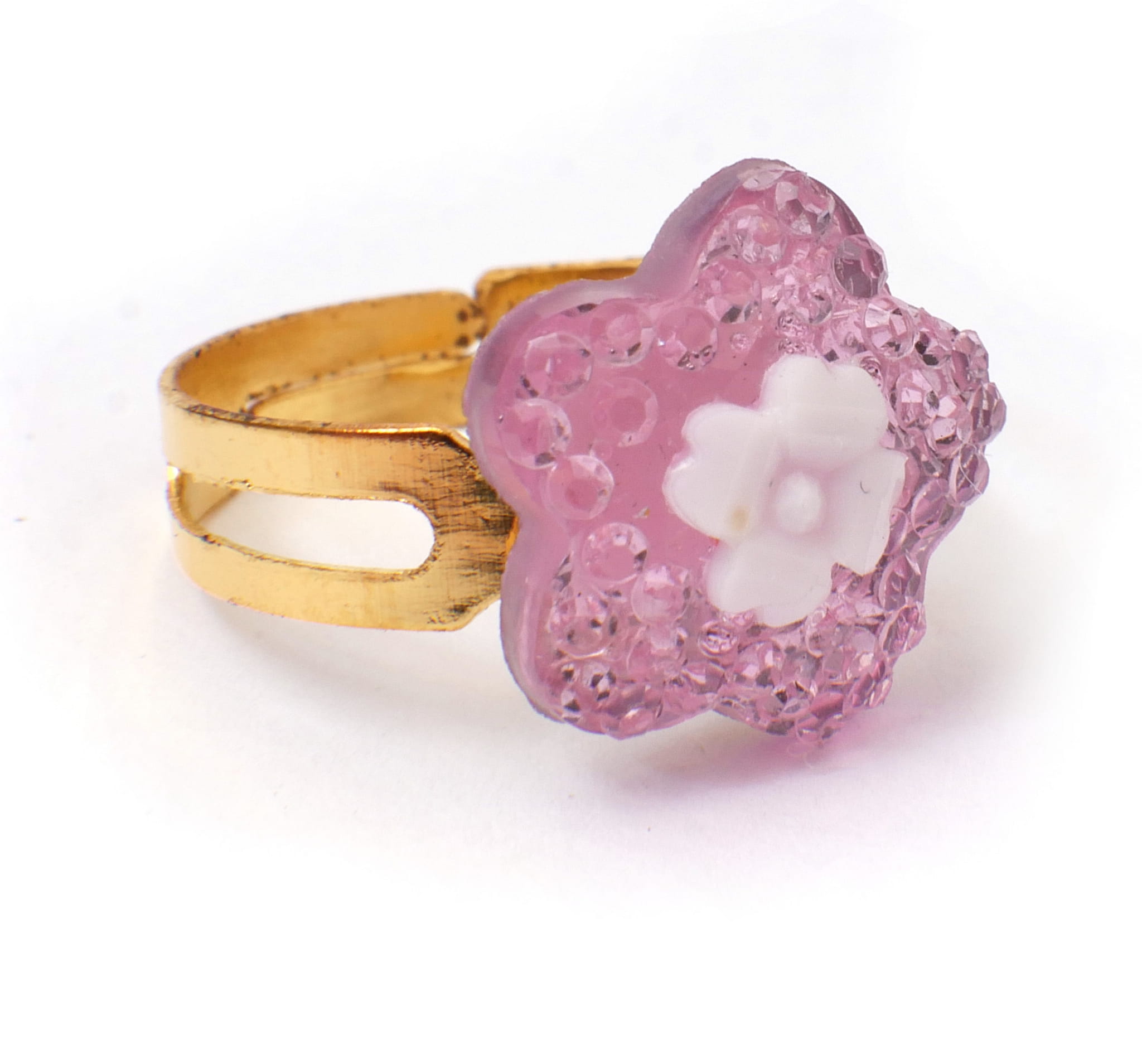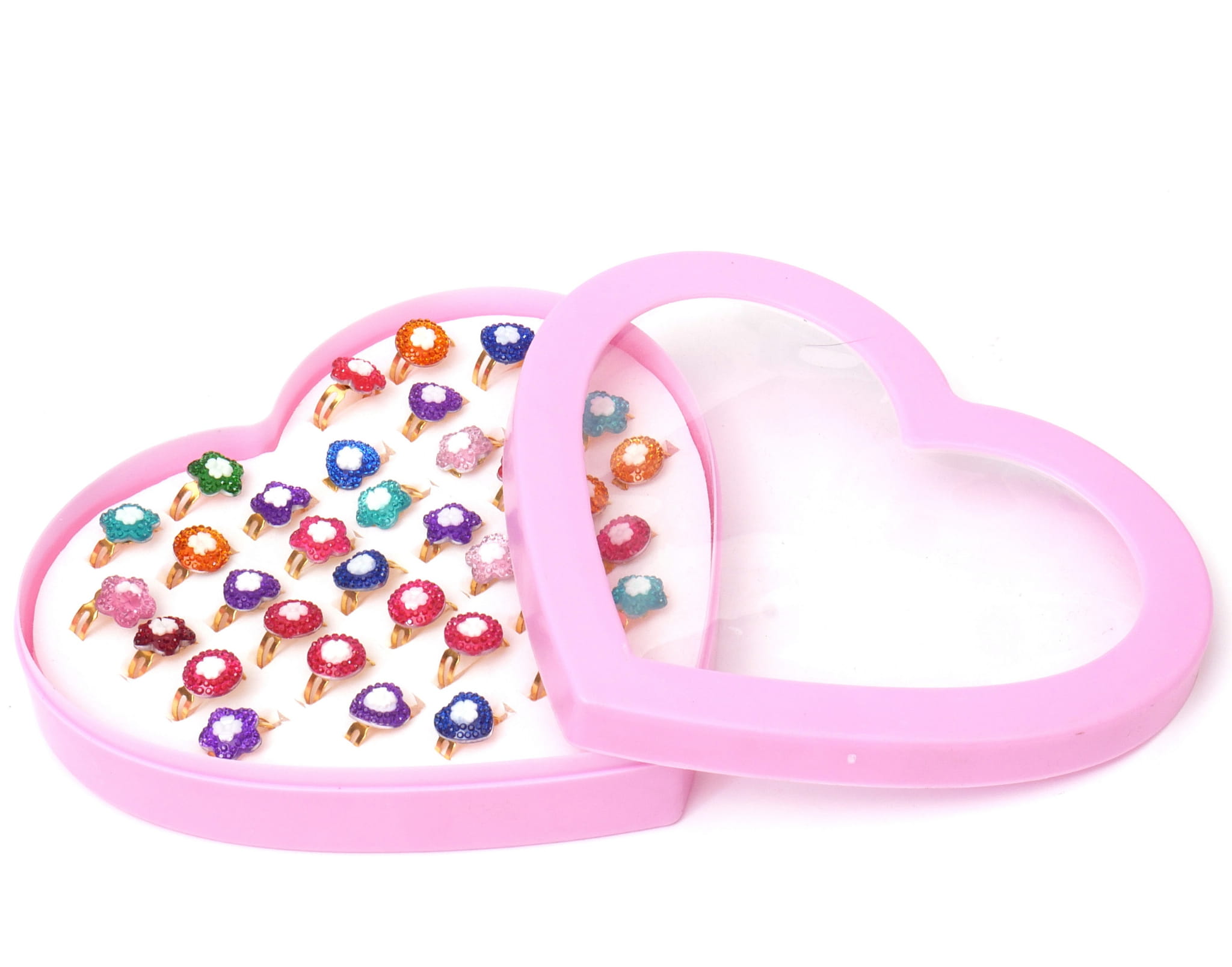 Śliczne pierścionki księżniczki. Wszystkie mają różnokolorowe sztuczne kamienie w kształtach serc, kwiatek, kropelki i kółka. Obrączka pierścionka jest nacięta, co sprawia, że jej rozmiar jest uniwersalny.