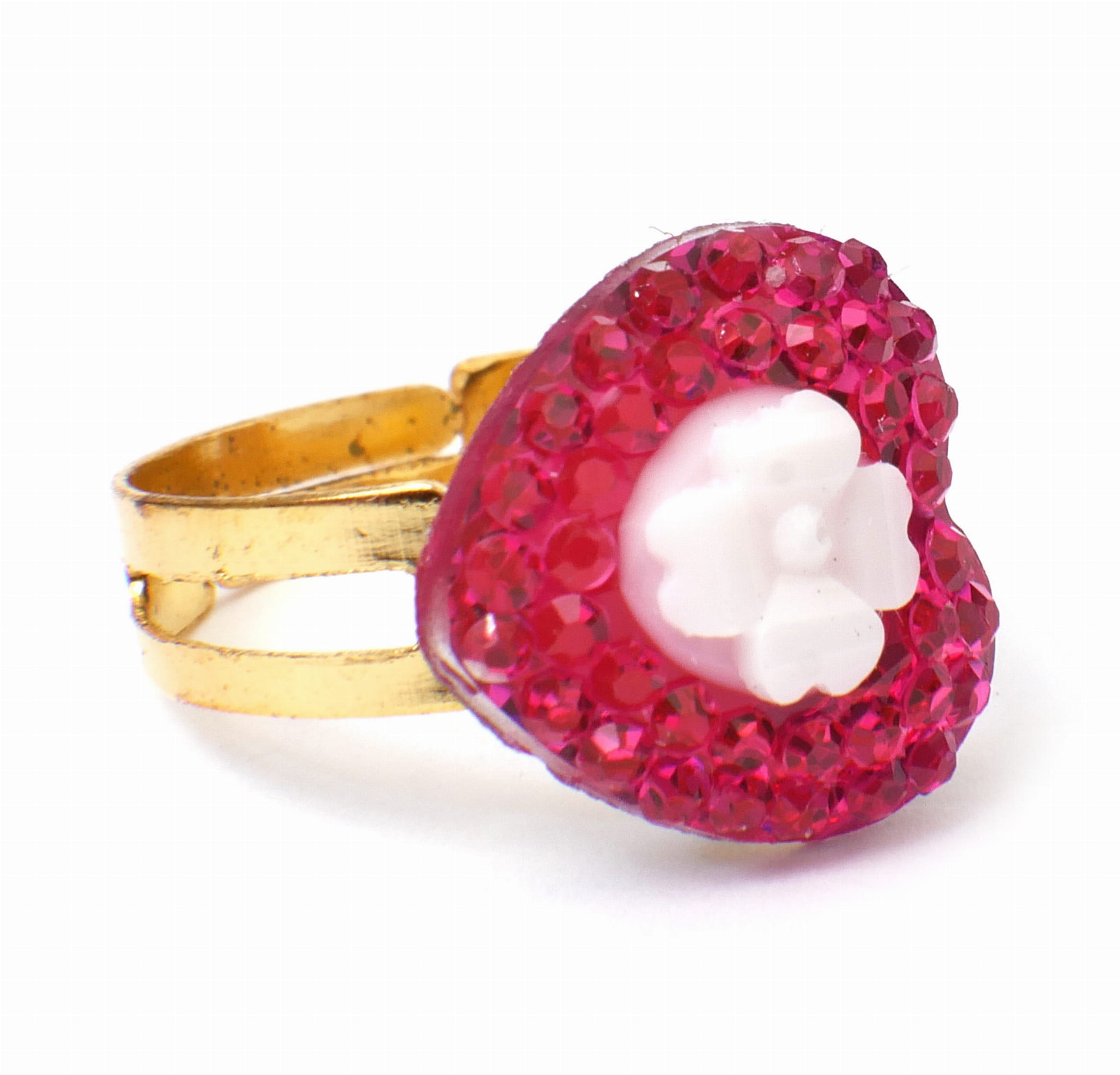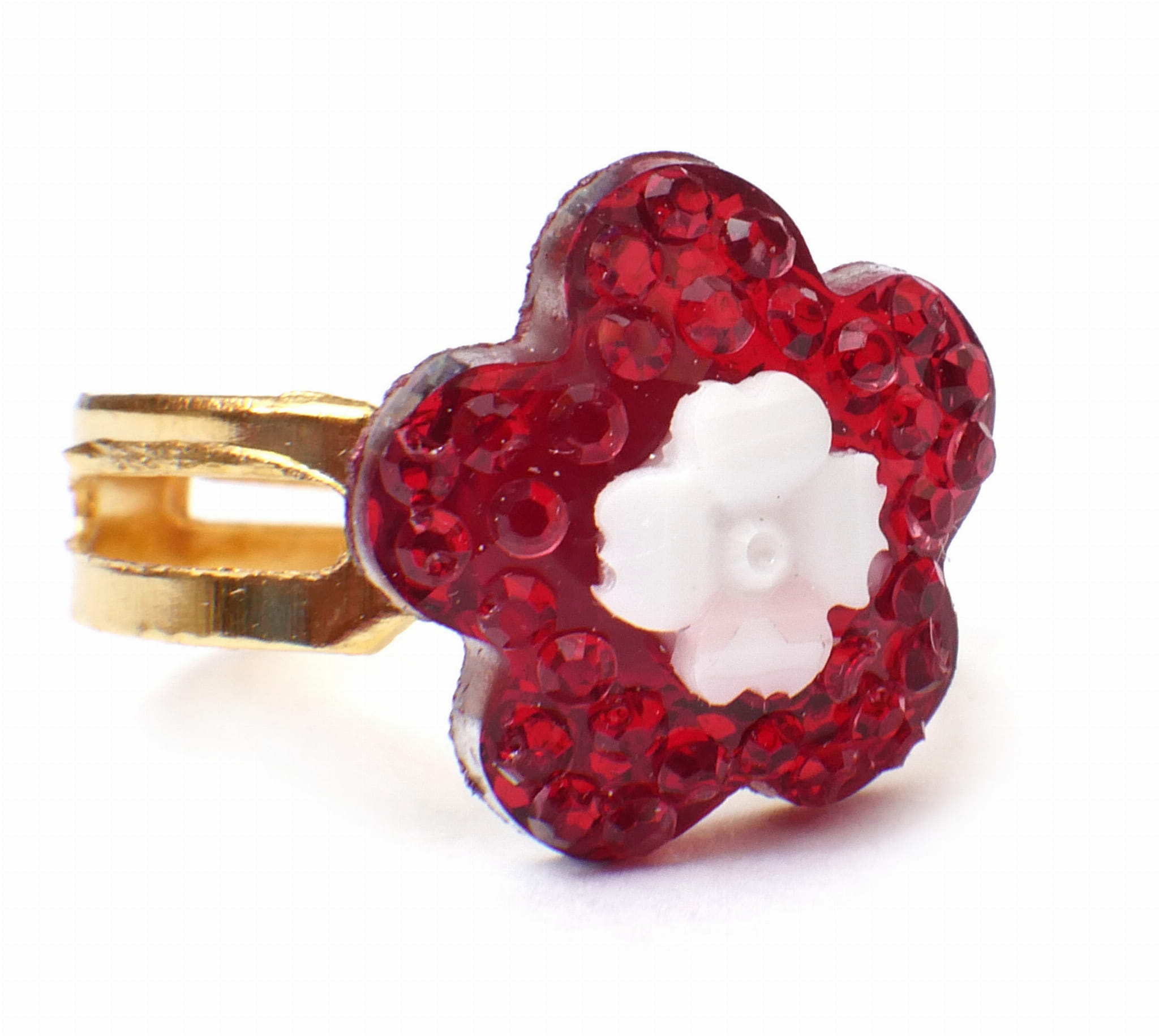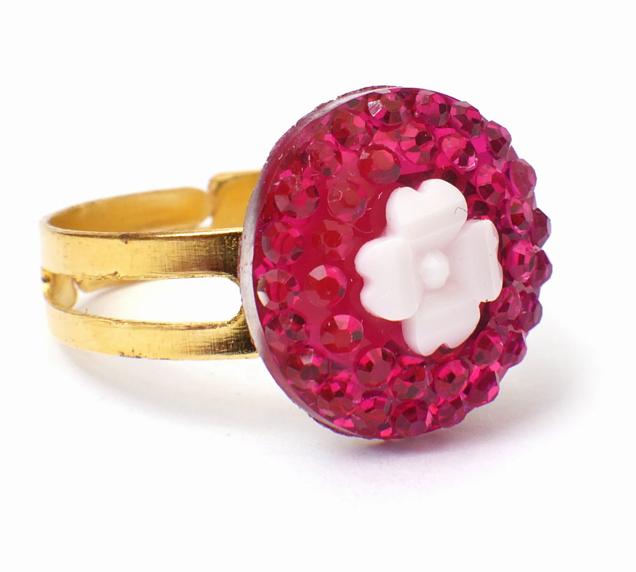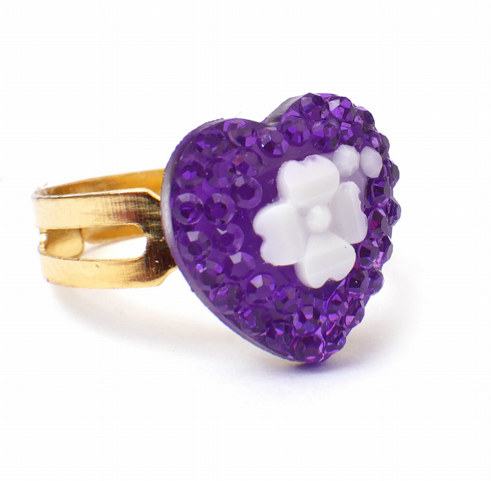 Śliczne pierścionki księżniczki. Wszystkie mają różnokolorowe sztuczne kamienie w kształtach serc, kwiatek, kropelki i kółka. Obrączka pierścionka jest nacięta, co sprawia, że jej rozmiar jest uniwersalny.