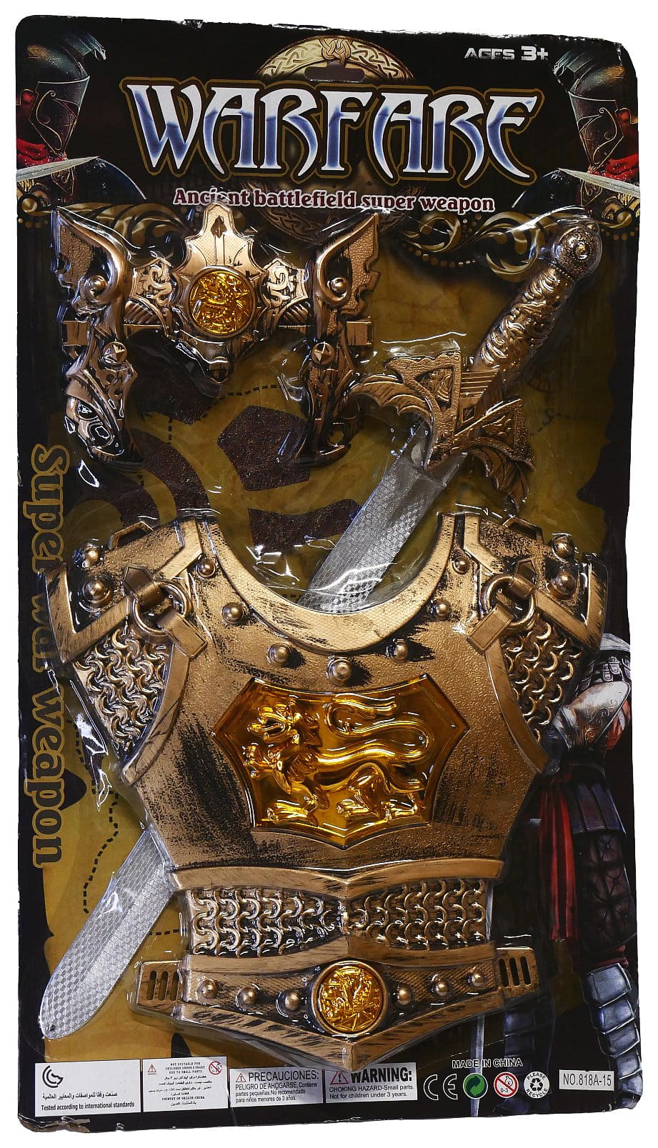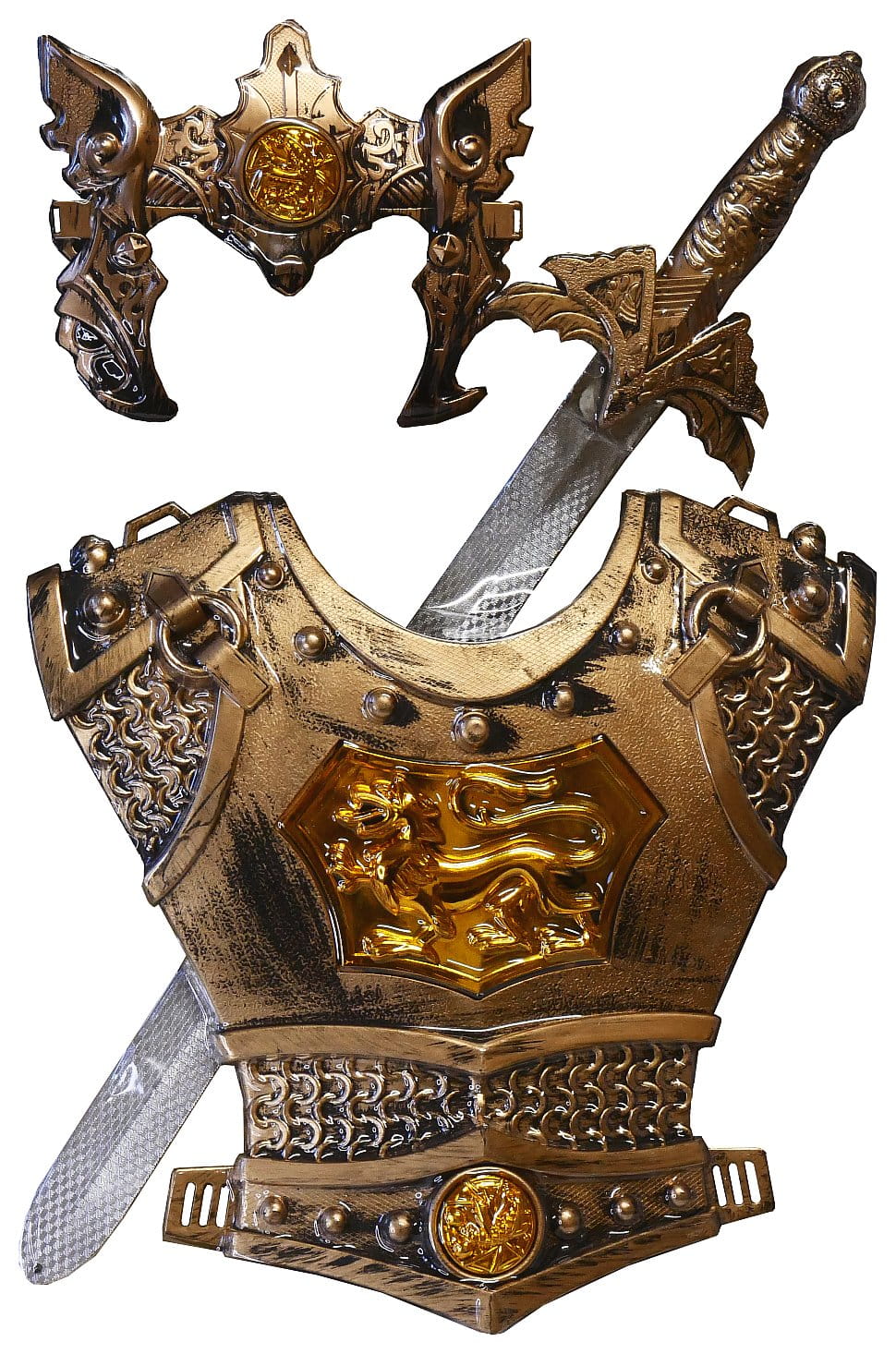 Ten wyjątkowy zestaw obejmuje wszystko, czego potrzebujesz, aby poczuć się jak prawdziwy rycerz gotowy do boju. Znajdziesz w nim zbroję, która wyróżnia się bogatymi detalami i wytłoczonymi motywami ze zwierzęcymi motywami. Dopełnieniem jest potężny miecz z brązową rękojeścią i srebrnym ostrzem, który jest gotowy do odważnych zadawań.