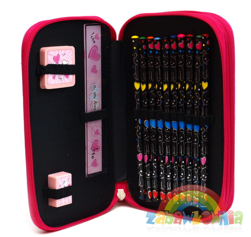 Dwustronny piórnik z wyposażeniem ze ślicznym kotkiem.