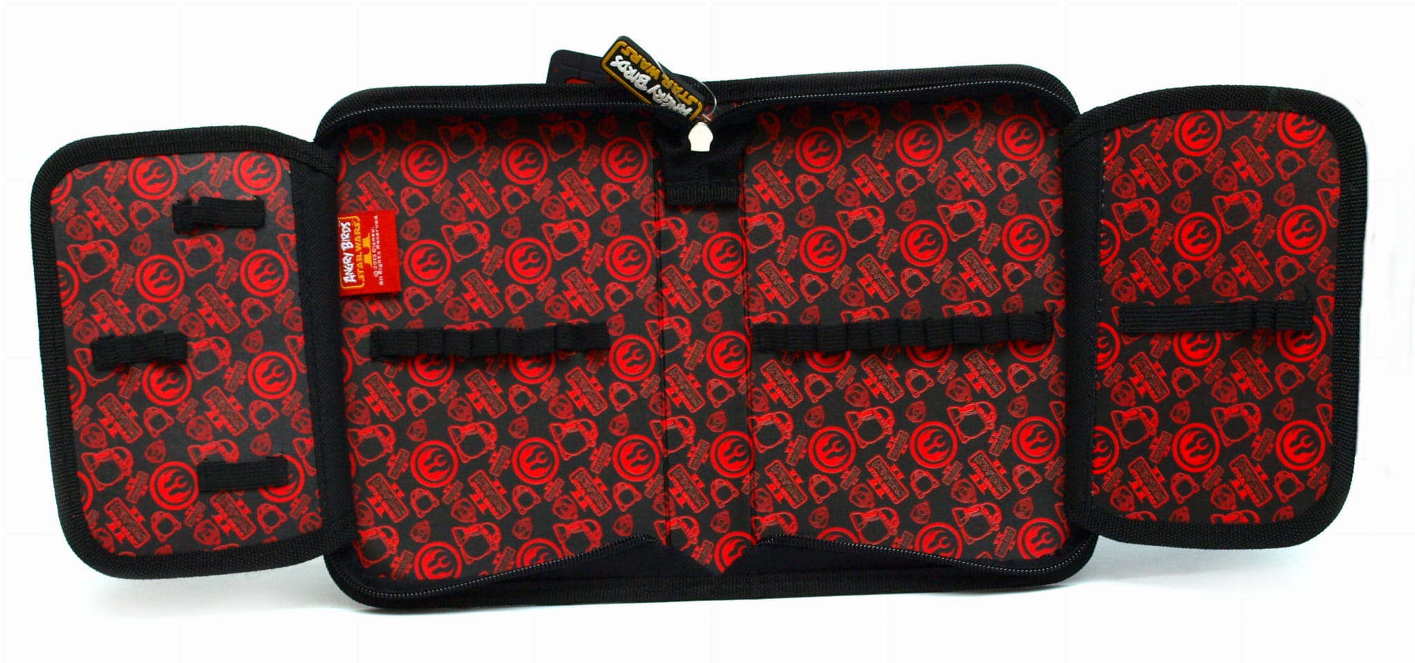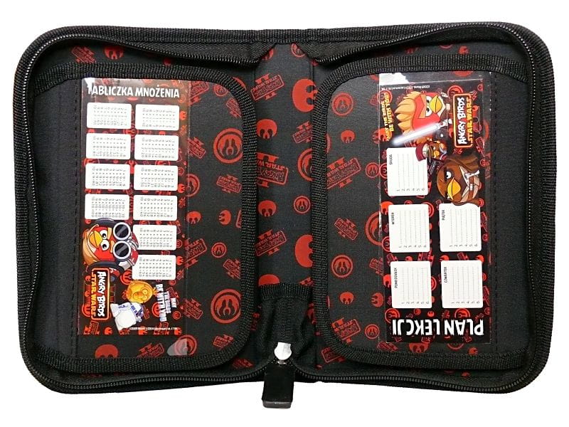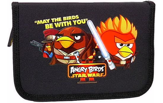Super pojedynczy dwuklapkowy piórnik ozdobiony wizerunkami bohaterów "tabletowej" gry bijącej rekordy popularności Angry Birds Star Wars.. Bez wyposażenia.