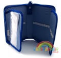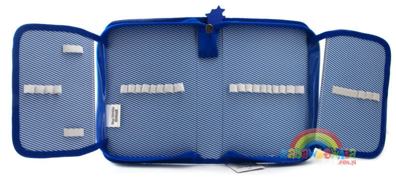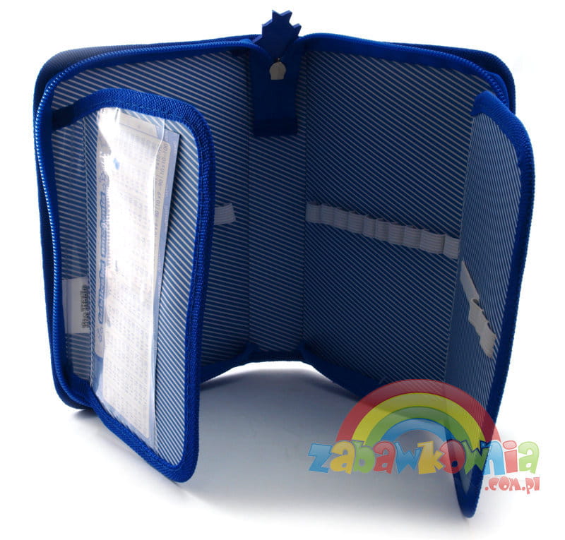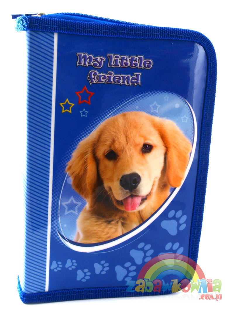 Śliczny piórnik z pieskiem. Piórnik ma dwie rozkładane klapki, w których znajduje się plan lekcji i tabliczka mnożenia.