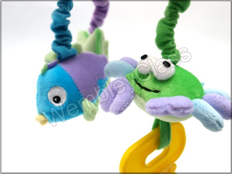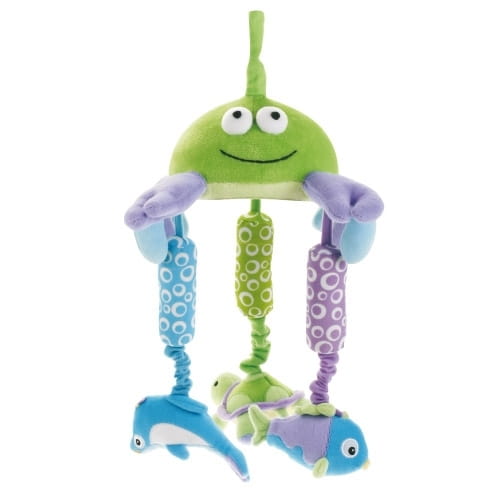 Morskie zwierzaki wprowadzają dzieci w świat barw, kształtów i miłych dla ucha dźwięków. Do grzechotki dołączone są dodatkowe elementy, wspomagająca rozwój dziecka.: sprężyste tasiemki i kolorowe, pluszowe piszczki. Pluszowa grzechotka do łóżeczka - krab posiada możliwość montażu w dowolnym miejscu (w zestawie jest klips/krokodylek, a zawieszka zakończona jest tasiemką z rzepem). W wiszących tasiemka, na których zawieszone są piszczki i gryzaczki znajdują się delikatnie dzwoniące dzwoneczki przy każdym puknięciu w zabawkę. Od spodu krabika znajduje się bezpieczne lusterko, które z pewnością zaintryguje maluszków.