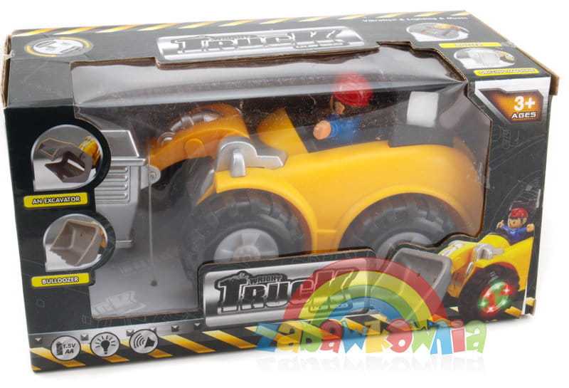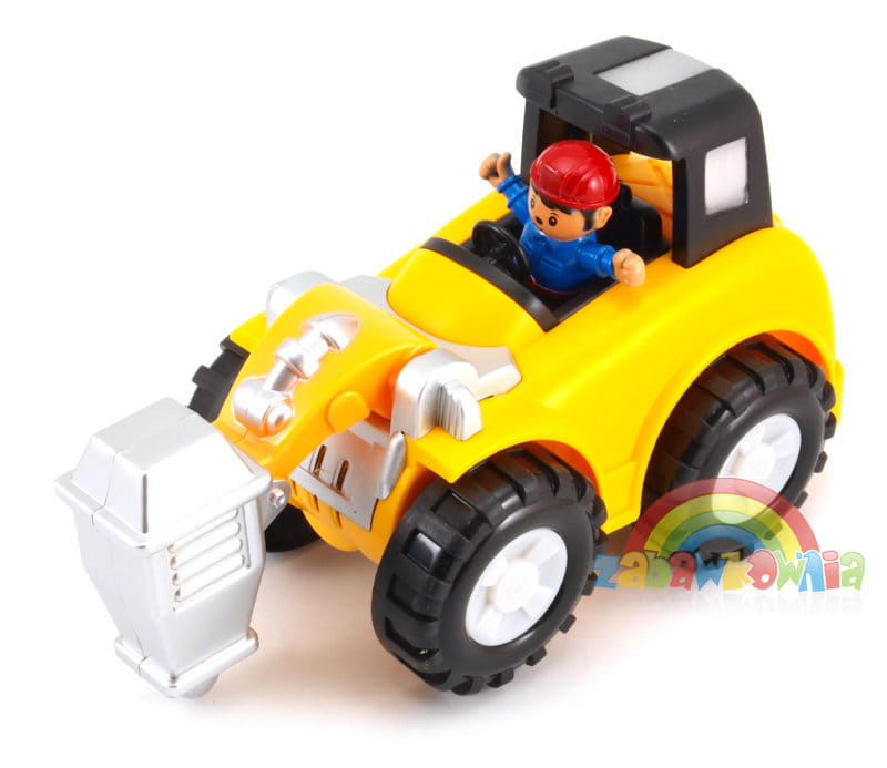Wszelkie rodzaju maszyny budowlane, a zwłaszcza te duże rozpalają wyobraźnie małych chłopców. Teraz maluch może mieć własną zabawkę, która jeździ odbijając się od przeszkód, a podczas jazdy gra i migają kolorowe światełka. Kolorowe lampki podświetlają koła buldożera, a figurka operatora maszyny wesoło kiwa się na boki.