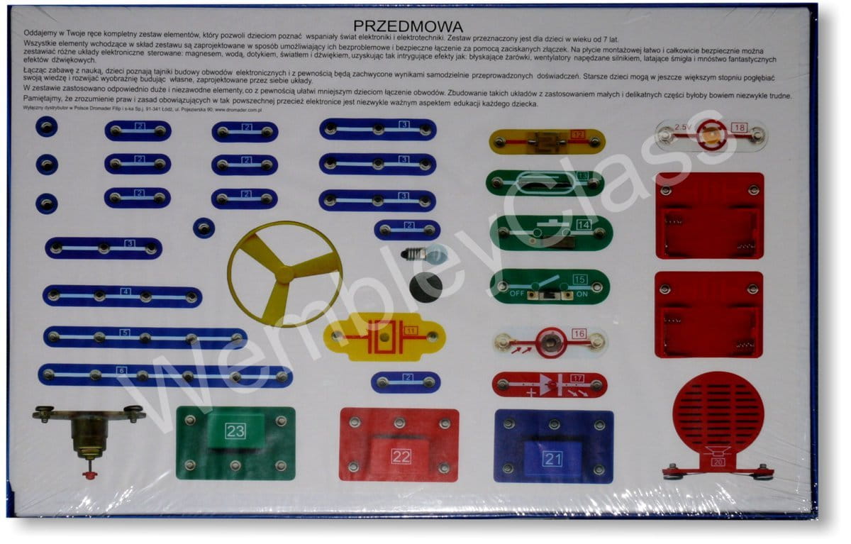 Oddajemy w Twoje ręce kompletny zestaw elementów, który pozwoli Ci wejść w tajemniczy świat elektroniki i elektrotechniki. Zestaw może służyć jako wspaniałe narzędzie, dzięki któremu poznasz tajniki tych ciekawych dziedzin wiedzy. Może być używany zarówno w szkole jak i w domu.
