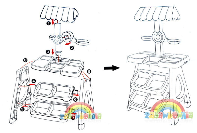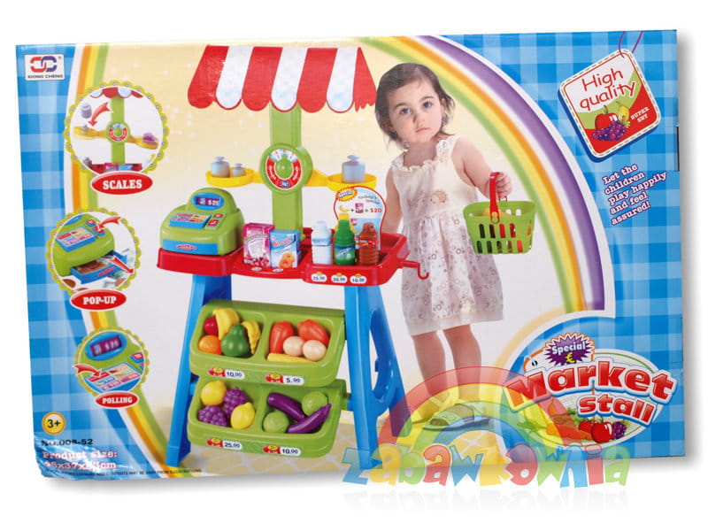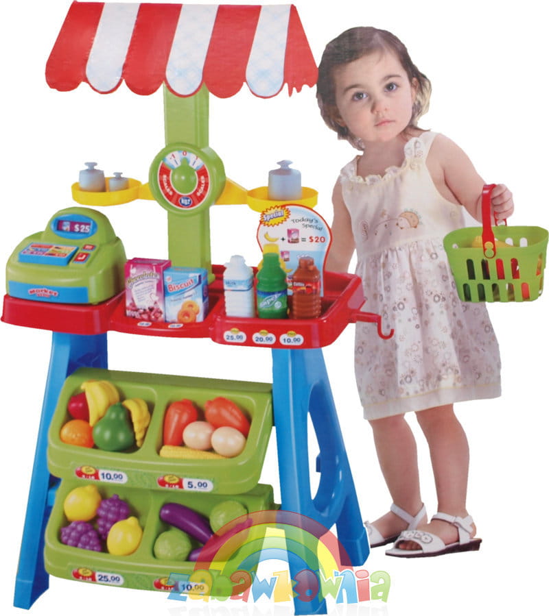 Dzieci lubią bawić się w "sklep". W takich zabawach uczą się liczyć, uczą się zachowań i najważniejsze, że jest to dla nich wspaniała rozrywka. Zestaw zawiera stoisko z ladą, wagą i daszkiem. Kasa ma otwieraną szufladkę, do której można wkładać zabawkowe pieniądze.