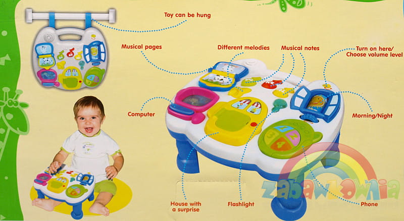 Wspaniały stoliczek edukacyjny, który zainteresuje każdego malca. Wiele dźwięków i migające światełka, ciekawe odgłosy i ruchome elementy, kolorowe obrazki i dźwiękowe przyciski - to są cech ciekawej zabawki, a wszystkie je ma edukacyjny stoliczek.
