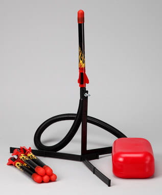 Siłę nośną rakiety uzyskują dzięki sprężonemu powietrzu przez skok dziecka na poduszkę. Pełny zestaw zawiera poduszkę powietrzną, wąż powietrzny z rurką, stojak oraz rakiety.