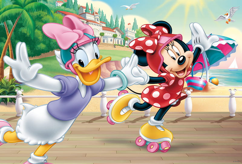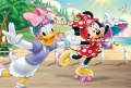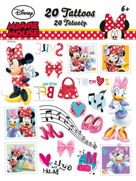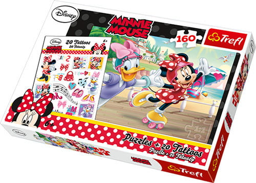 Zestaw puzzli 160 elementów i dwudziestu zmywalnych tatuaży z bohaterami filmu dla dzieci "Myszka Minnie". Ułożony obrazek z puzzli ma wymiary 41x27,8cm.