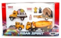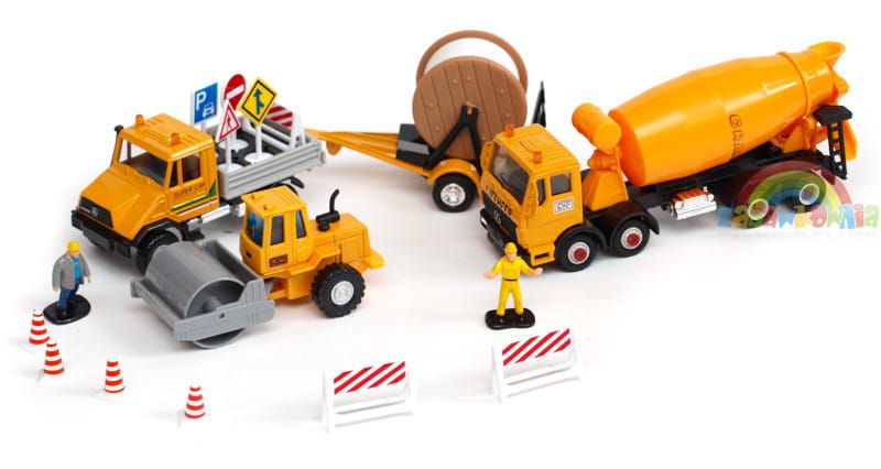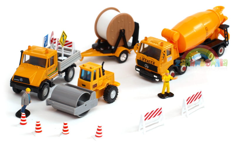 Zestaw do zabawy dla małych miłośników pojazdów budowlanych i służb drogowych. Zestaw składa się z dwóch samochodów i walca. Mercedes UNIMOG przewozi znaki drogowe i barierkę, a dołączyć możemy przyczepkę z bębnem kablowym. Mamy również ciężarówkę Mercedes betoniarkę i walec drogowy. Ponadto w zestawie znajdziemy dużo dodatkowych akcesoriów, w tym dwie figurki robotników.