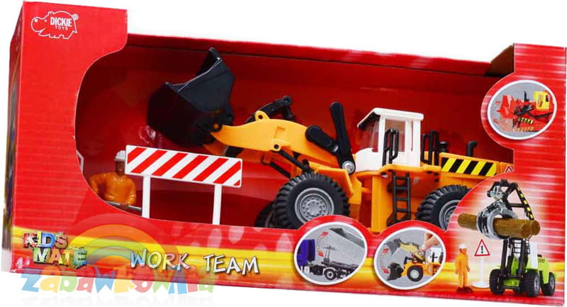Spycharko ładowarka z serii Work Team Dickie to ciekawa zabawka dla małych miłośników maszyn budowlanych. Pojazd ma gumowe opony unoszoną łyżkę i skrętne zawieszenie.